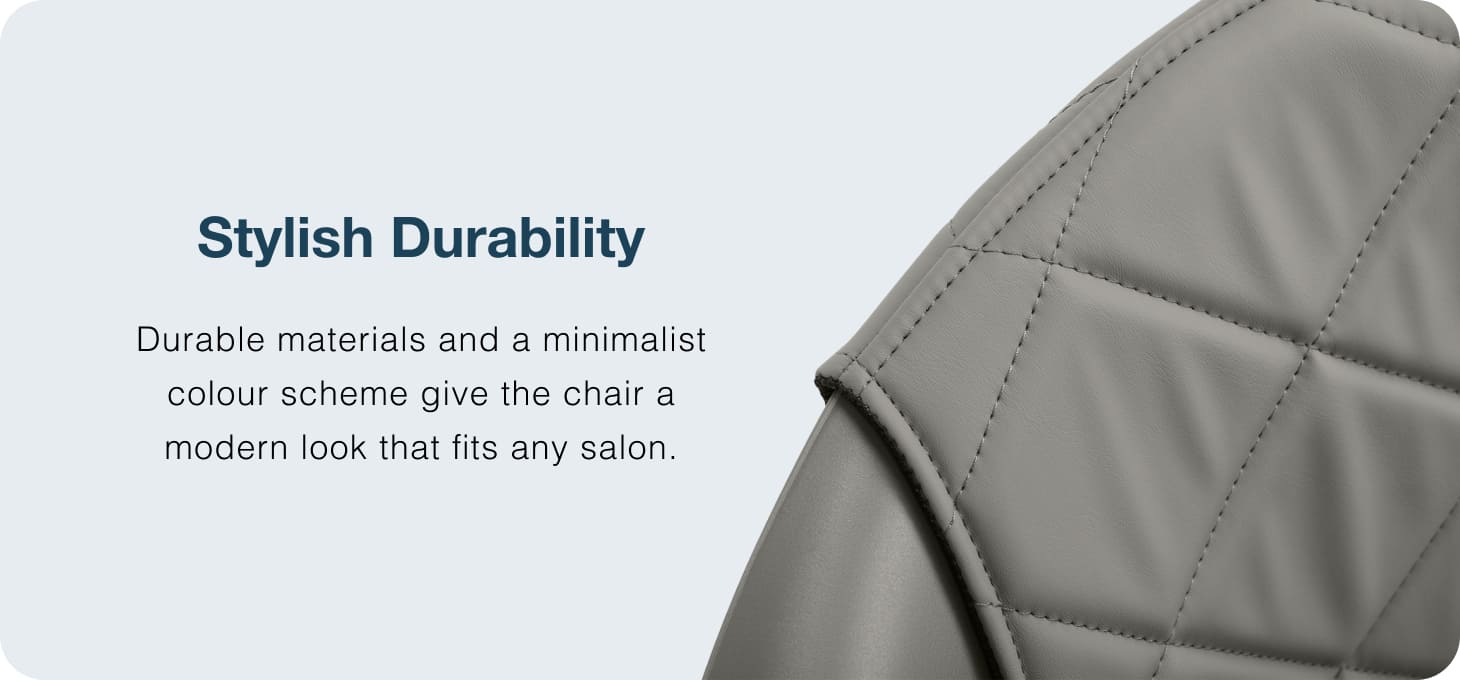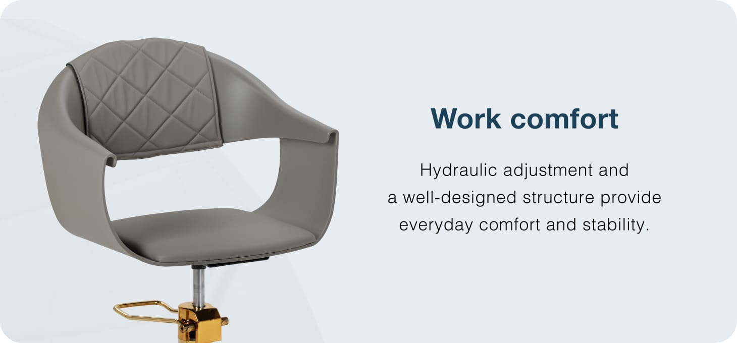 The sturdy grey plastic construction ensures durability. The materials used make the equipment comfortable to use, resistant to moisture and easy to clean. The round base in shades of gold guarantees stability and strength. The minimalist grey colour combined with the aesthetic stitching and the gold of the base makes the chair fit perfectly into various styles of hairdressing salon interiors, introducing an elegant and modern accent.