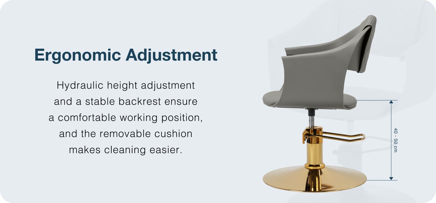 The durable hydraulic lift makes it possible to adjust the seat height within 40-50 cm - also during use. This allows the chair to be adjusted to the client's height and the hairdresser's preferences, promoting an ergonomic working position. The backrest provides stable back support, which is particularly useful during long treatments. For added comfort, the chair is fitted with a cushion covered with synthetic leather and fastened with Velcro - a solution that makes cleaning and maintenance easier.
