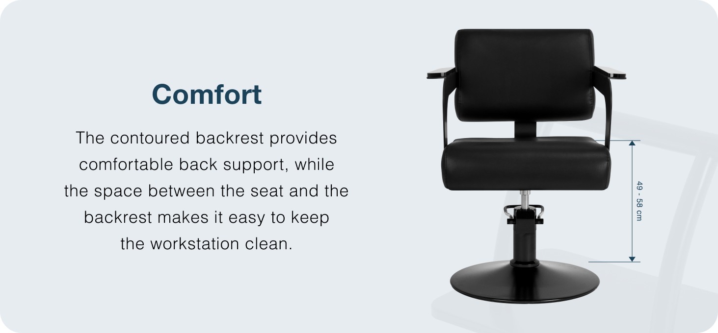 The efficient hydraulic lift allows for precise adjustment of the seat height within the range of 49-58 cm, which allows for comfortable positioning of the chair and ensures ergonomic work. The profiled backrest provides adequate back support, promoting a comfortable position even during longer visits to the salon. The space between the seat and the backrest makes it easy to keep the workstation clean.