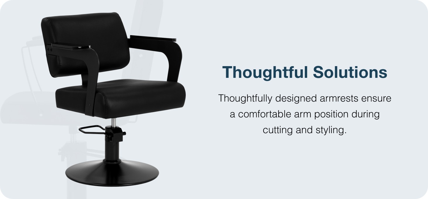 The full rotation mechanism improves the hairdresser's work and increases freedom of movement during treatments. The solid wheel-shaped base guarantees stability during use. The comfortable seat ensures high comfort of use, even during long hours of treatment. The modern armrests are made of a combination of metal and acrylic with a semi-transparent finish. The visible structural elements give the chair an original character. The appropriate height of the armrests promotes the natural positioning of the client's shoulders, which has a positive effect on comfort during haircuts and styling.
