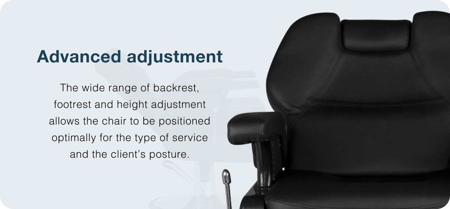 An efficient hydraulic lift allows for free seat height adjustment between 54-65.5 cm, even when the client is already seated in the chair. This ensures ergonomic working conditions and makes it easy to adjust the seat level to suit the height of both client and practitioner. The reclining backrest and adjustable footrest allow the client to be placed in a comfortable, semi-reclining position for better access during selected treatments. In addition, the extendable headrest provides stable head support.