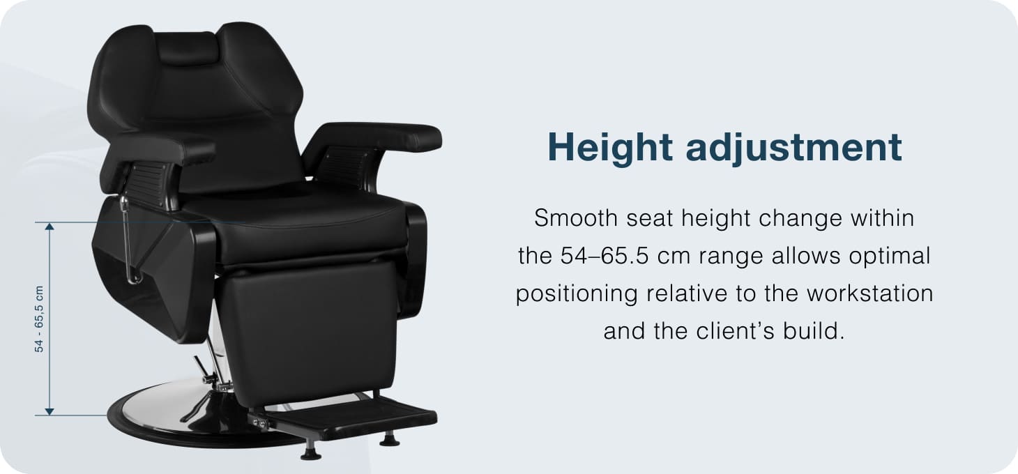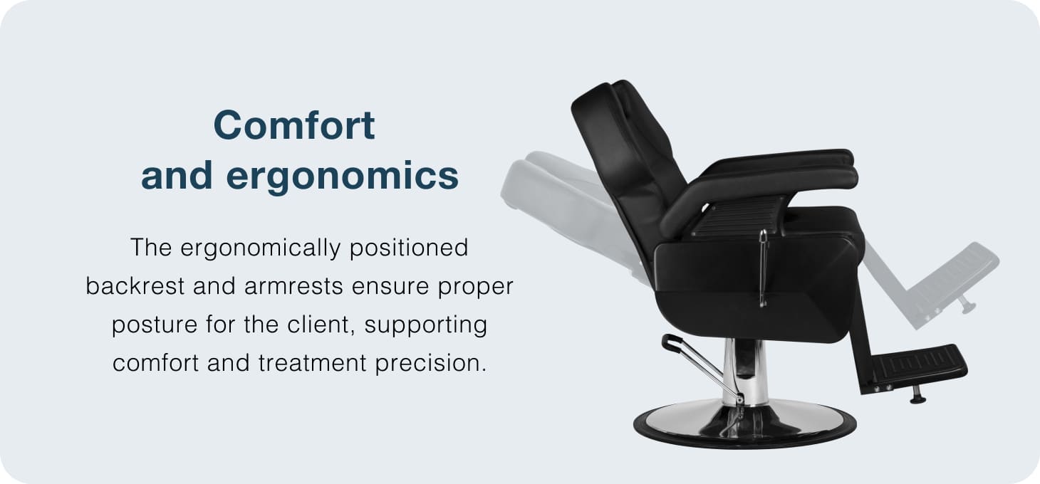 The comfortable seat ensures client comfort during a variety of services. The ergonomic backrest offers excellent back support and allows for a comfortable position, which is particularly important for longer treatments. The full rotation mechanism increases freedom of movement and enhances the barber's work. Upholstered armrests, placed at the right height, help to position the client's shoulders correctly, preventing hunching and facilitating precise cuts.