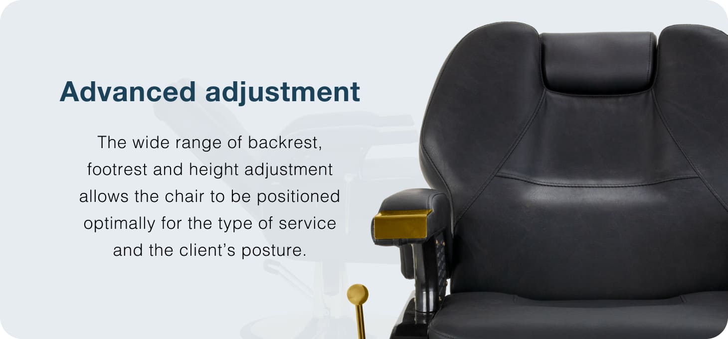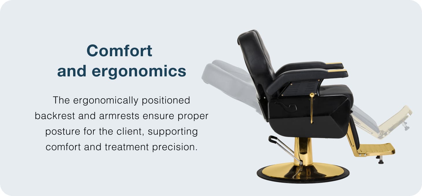 The comfortable seat ensures client comfort during a variety of services. The ergonomic backrest offers excellent back support and allows for a comfortable position, which is particularly important for longer treatments. The full rotation mechanism increases freedom of movement and enhances the barber's work. Upholstered armrests, placed at the right height, help to position the client's shoulders correctly, preventing hunching and facilitating precise cuts.