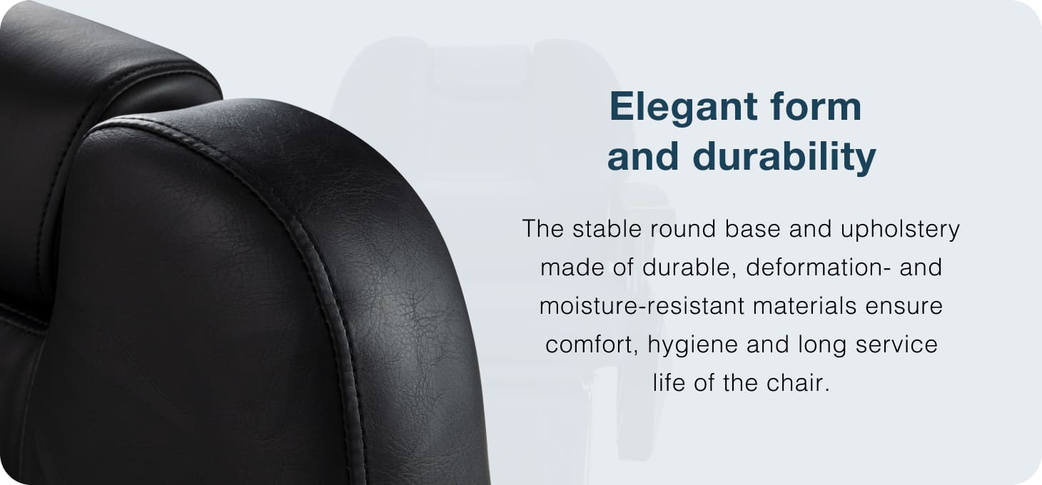 An efficient hydraulic lift allows for free seat height adjustment between 54-65.5 cm, even when the client is already seated in the chair. This ensures ergonomic working conditions and makes it easy to adjust the seat level to suit the height of both client and practitioner. The reclining backrest and adjustable footrest allow the client to be placed in a comfortable, semi-reclining position for better access during selected treatments. In addition, the extendable headrest provides stable head support.