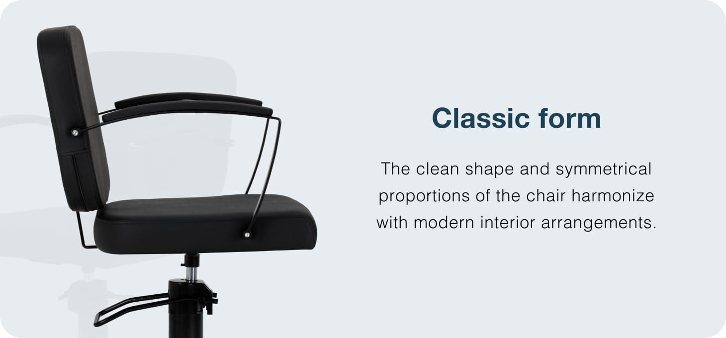 The chair's solid, square base ensures stability, while its smooth surface makes it easy to keep clean. The aesthetically pleasing, ergonomically shaped upholstered armrests are placed at an optimum height, allowing the client to adopt a natural, correct position. This enhances comfort and promotes relaxed posture, which translates into smoother treatments and enables the hairdresser to work precisely at each stage of the service.