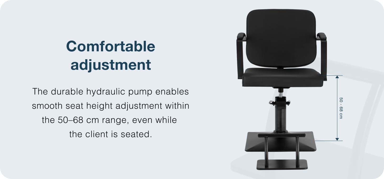 The durable hydraulic lift ensures seat height adjustment of 50-68 cm, also during use, which allows the chair to be ergonomically positioned in relation to the height of the client and the professional. The backrest is properly shaped to ensure a comfortable position, which is particularly important for longer treatments. In addition, the chair is equipped with a matching footrest with a non-slip base that stably supports the client's feet, increasing comfort throughout the treatment.