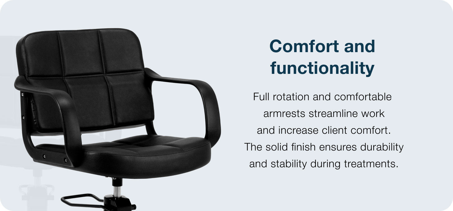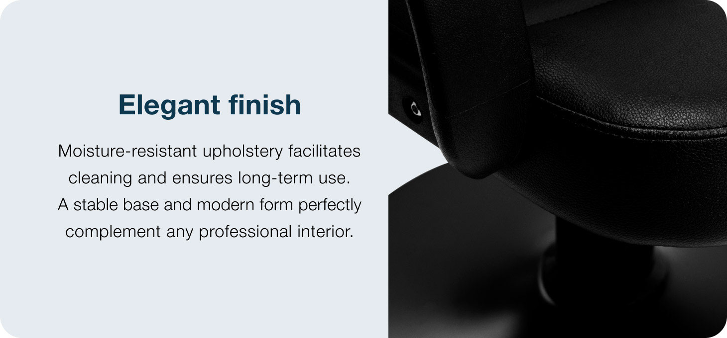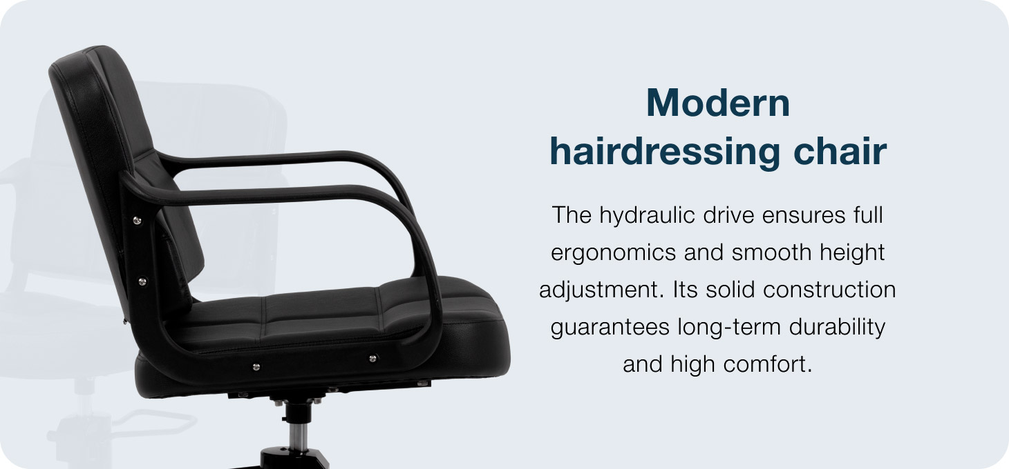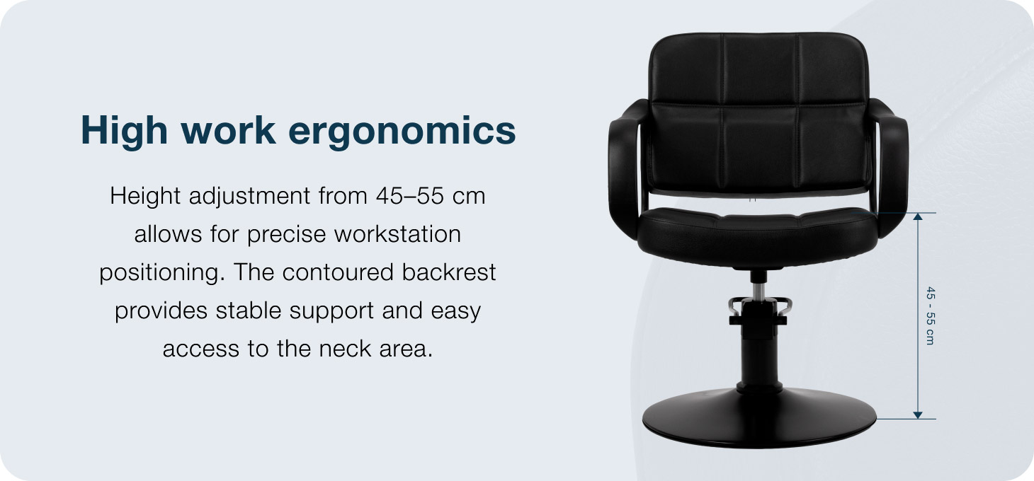 The elegant form combines modern style with durability and a stable construction, creating aesthetic and functional hairdressing salon furniture. The black synthetic leather upholstery is moisture-resistant and easy to keep clean, ensuring long-lasting, comfortable use. The round base ensures stability and durability during daily use, whilst the carefully crafted details highlight the quality of the model. The versatile, minimalist colour scheme, combined with decorative stitching, means the chair fits perfectly into a variety of salon designs, adding an elegant touch to the interior.