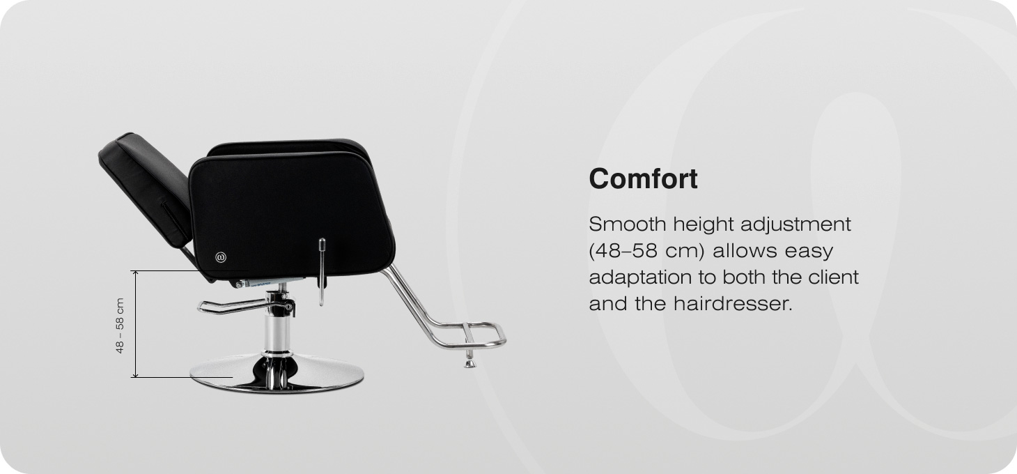 A robust hydraulic lift allows for smooth adjustment of the seat height within a range of 48–58 cm, even whilst the chair is in use. This feature supports ergonomic working, allowing the position to be easily adjusted to suit both the client’s and the hairdresser’s height. The profiled backrest provides stable back support, helping to maintain a comfortable position even during longer treatments. The integrated footrest enhances comfort, providing stable support for the feet.