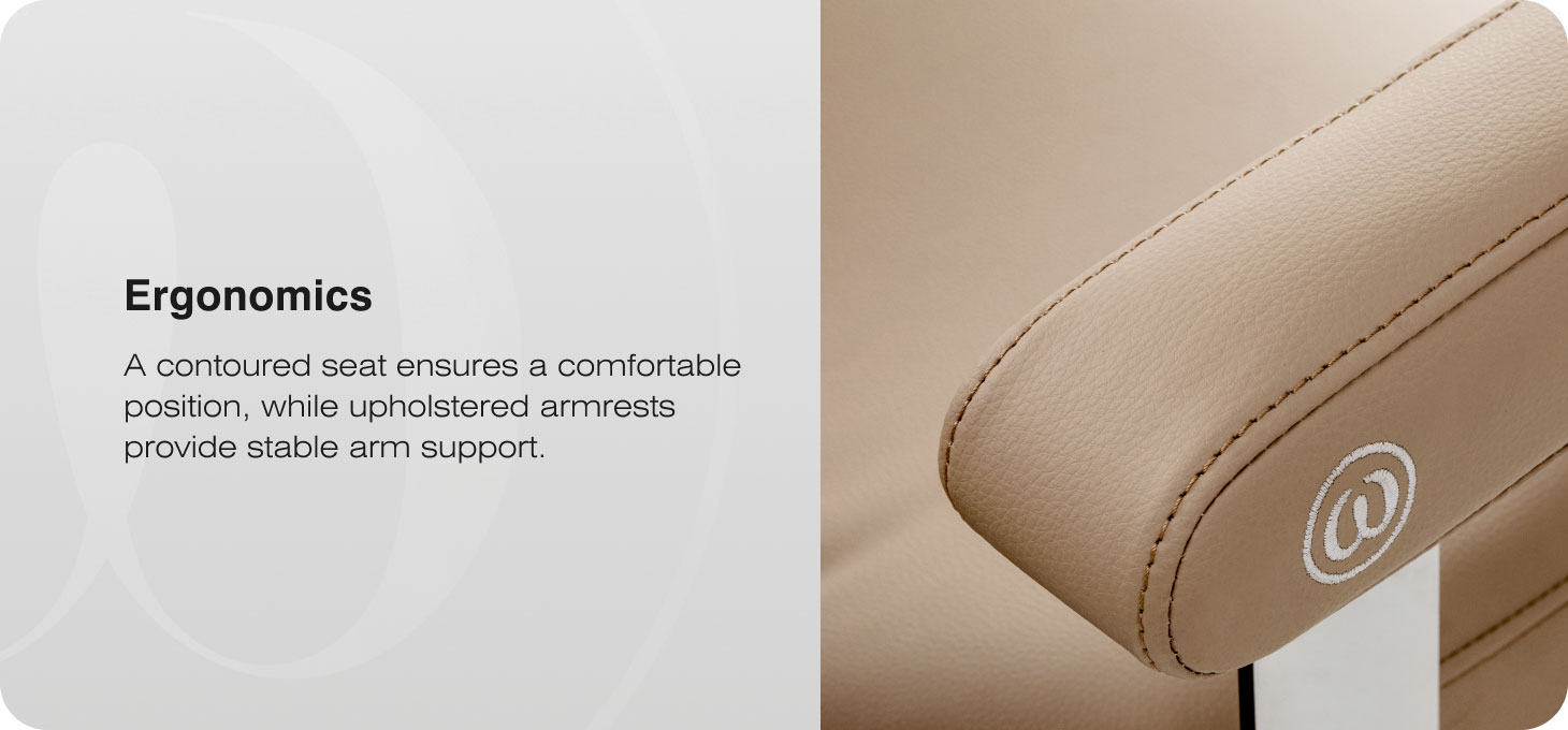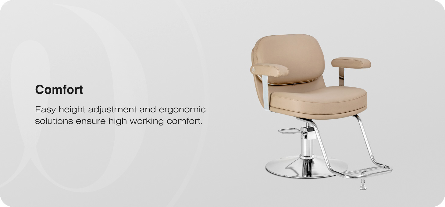 The chair’s design ensures comfort even during longer treatments. The profiled seat promotes a comfortable body position, while the ergonomic, padded armrests provide stable support for the arms. The wide seat surface enhances the client’s comfort. The full-rotation mechanism increases the stylist’s freedom of movement and makes it easier to manoeuvre around the chair.