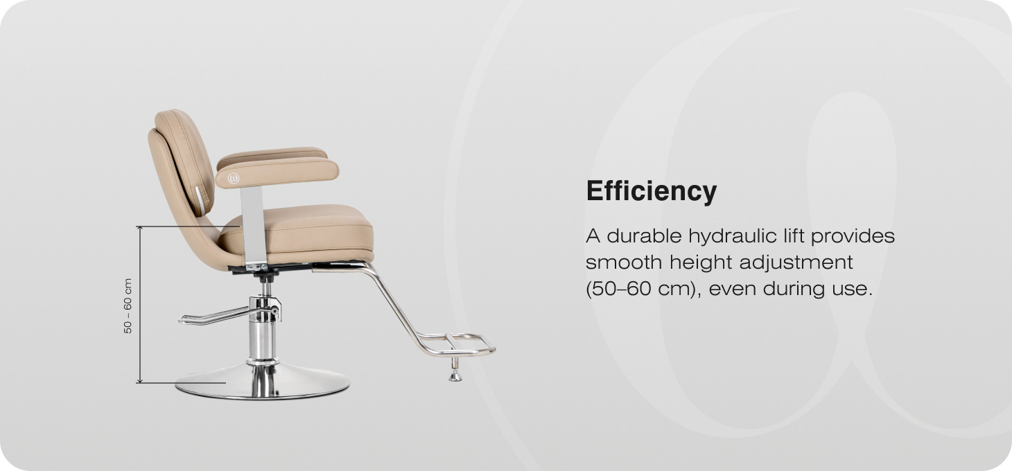 The robust hydraulic lift allows for smooth seat height adjustment within a range of 50–60 cm, even whilst the chair is in use. This promotes ergonomic working, allowing the position to be easily adjusted to suit both the client’s and the hairdresser’s height. The profiled backrest provides proper back support and a comfortable position during treatments. The integrated footrest provides stable support for the feet, enhancing the user’s comfort.