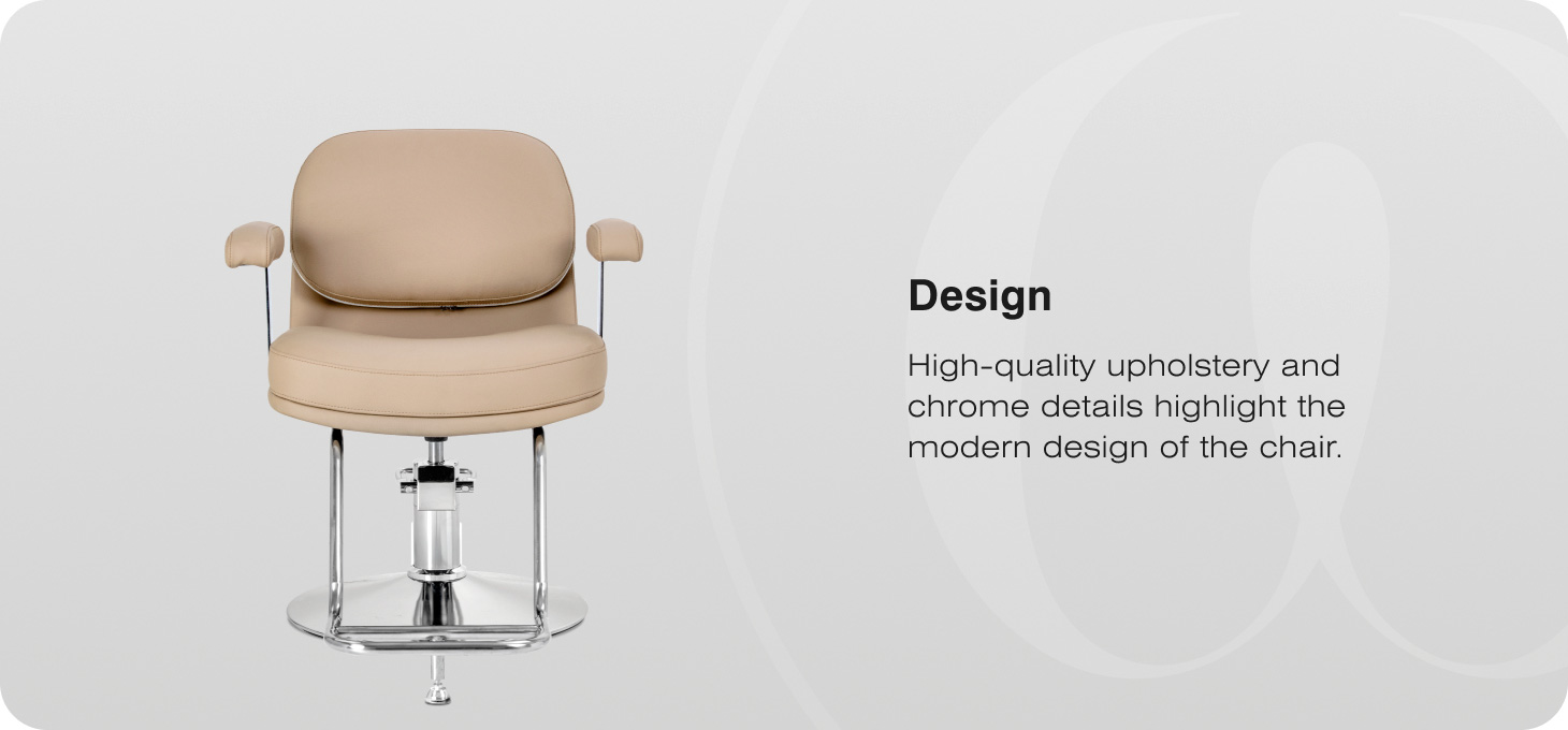 The model stands out with its modern, subtle styling, which perfectly emphasises the professional character of the salon. The upholstery, made of high-quality synthetic leather in an elegant beige shade, lends the whole a sense of lightness and style. The upholstery material is durable, moisture-resistant and easy to keep clean. The metal structural elements with a chrome finish emphasise the modern character of the furniture, while the round base ensures stability and an aesthetic appearance of the entire design.