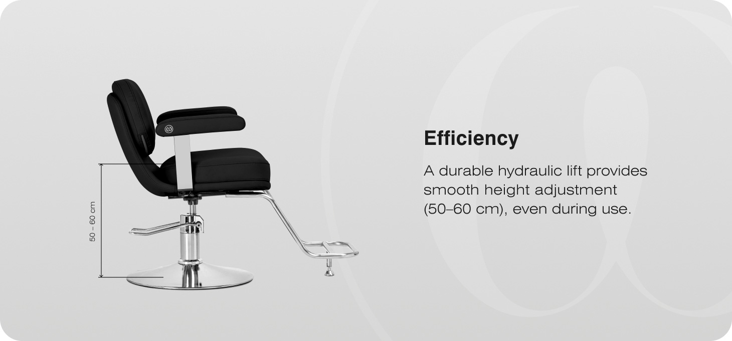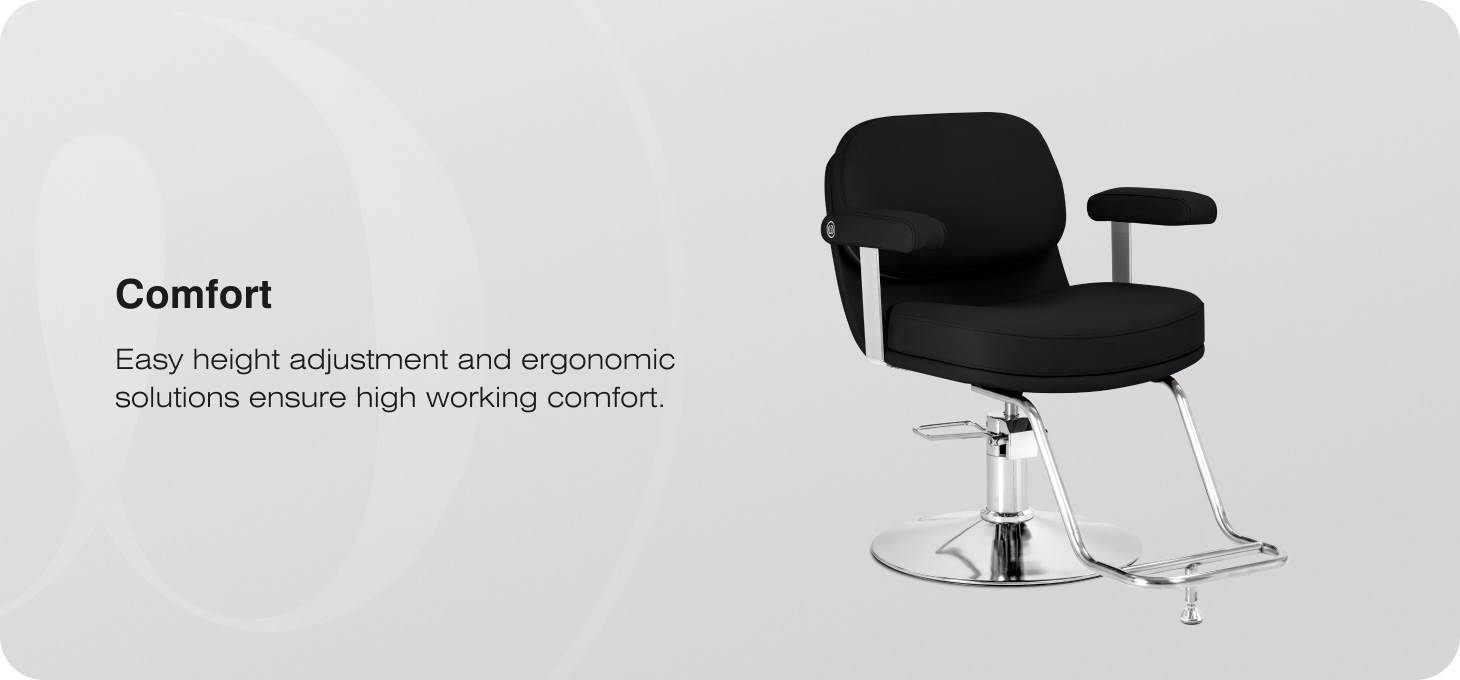 The robust hydraulic lift allows for smooth seat height adjustment within a range of 50–60 cm, even whilst the chair is in use. This promotes ergonomic working, allowing the position to be easily adjusted to suit both the client’s and the hairdresser’s height. The profiled backrest provides proper back support and a comfortable position during treatments. The integrated footrest provides stable support for the feet, enhancing the user’s comfort.