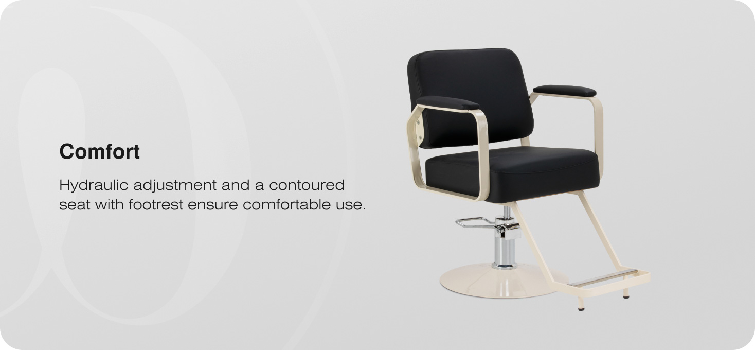 The durable hydraulic lift allows for smooth adjustment of the seat height within a range of 49–59 cm, even while the chair is in use. This supports ergonomic working, allowing the position to be easily adjusted to suit the height of both the client and the hairdresser, which significantly enhances the comfort of service provision. The profiled backrest provides stable back support and helps maintain a comfortable position even during longer treatments. A key feature is the footrest, designed to match the model, which provides stable support for the feet, enhancing comfort of use.