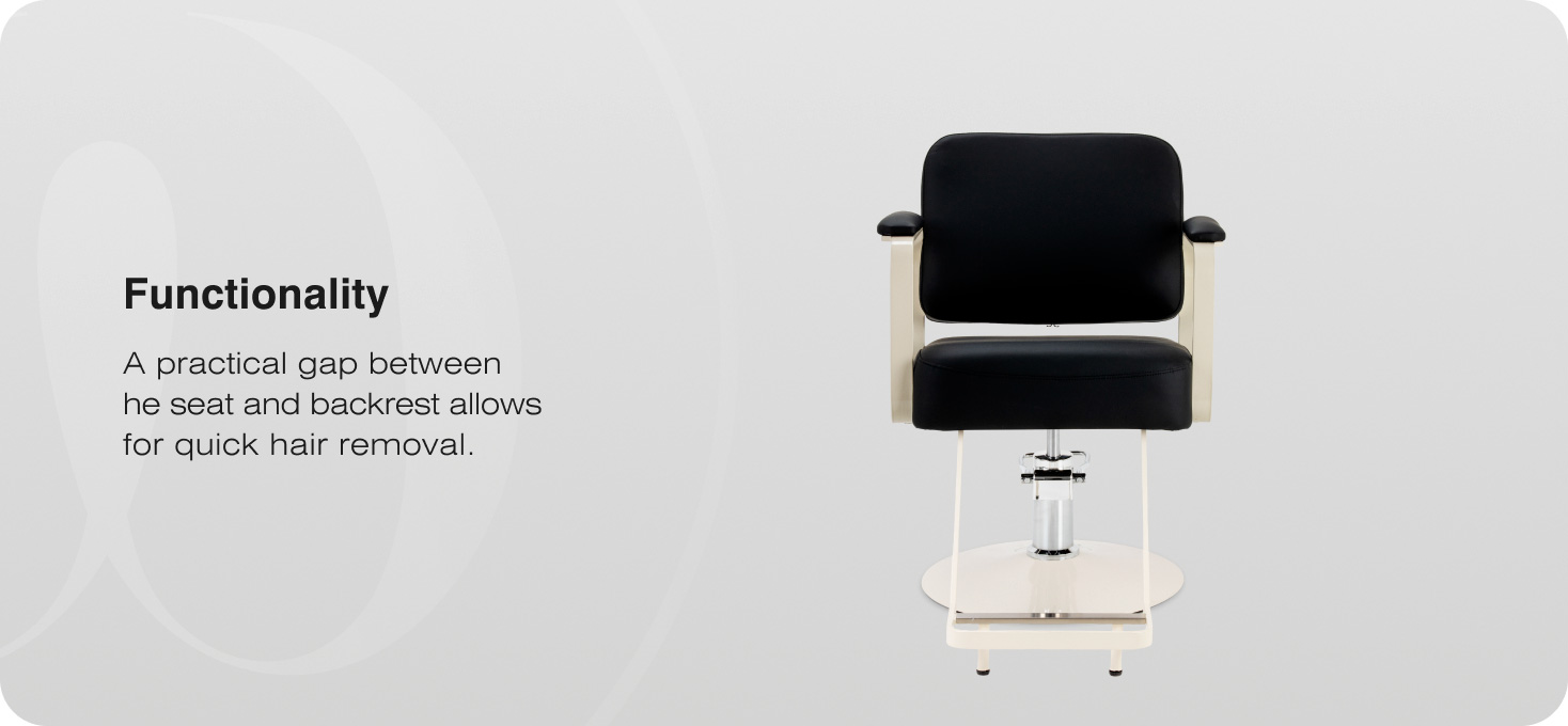The chair’s design has been designed with comfort in mind during long hours of work in the salon. The thick, soft seat and ergonomic metal armrests, partially covered with upholstery, support the client’s natural posture and facilitate the precise performance of hairdressing services. The full-rotation mechanism increases freedom of movement, which translates into smoother and more efficient work. The practical space between the seat and the backrest makes it easy to quickly remove hair, helping to keep the workstation clean.