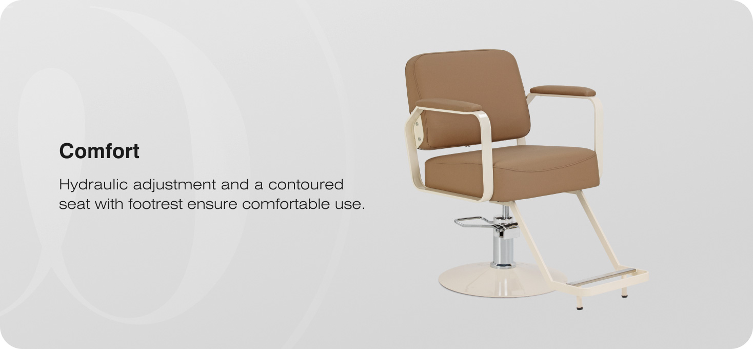 The Omega Aurora hairdressing chair combines modern design with practical functionality, making it ideal for everyday use in a professional hairdressing salon. The efficient hydraulic lift allows for smooth height adjustment, while the profiled seat and footrest ensure a comfortable position during longer treatments. Its minimalist form fits perfectly into modern interior designs.