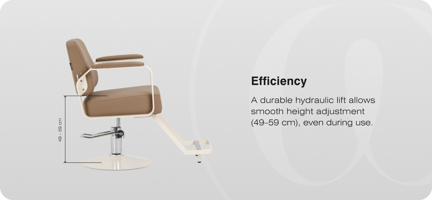 The durable hydraulic lift allows for smooth adjustment of the seat height within a range of 49–59 cm, even while the chair is in use. This supports ergonomic working, allowing the position to be easily adjusted to suit the height of both the client and the hairdresser, which significantly enhances the comfort of service provision. The profiled backrest provides stable back support and helps maintain a comfortable position even during longer treatments. A key feature is the footrest, designed to match the model, which provides stable support for the feet, enhancing comfort of use.
