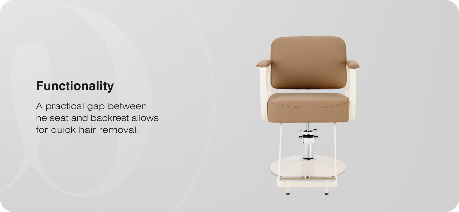 The chair’s design has been designed with comfort in mind during long hours of work in the salon. The thick, soft seat and ergonomic metal armrests, partially covered with upholstery, support the client’s natural posture and facilitate the precise performance of hairdressing services. The full-rotation mechanism increases freedom of movement, which translates into smoother and more efficient work. The practical space between the seat and the backrest makes it easy to quickly remove hair, helping to keep the workstation clean.