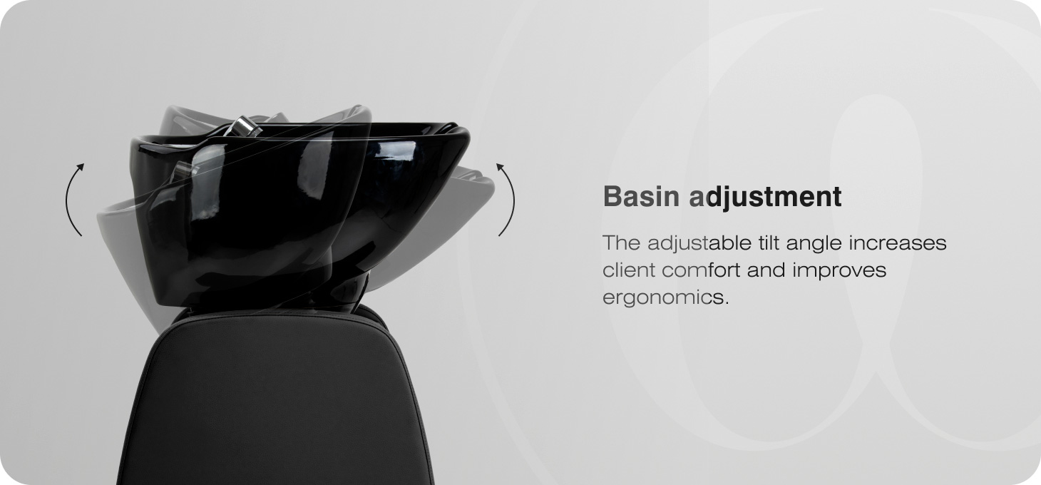 The deep, white ceramic basin has been designed for comfortable hair washing and care treatments. Its profiled shape minimises splashing of water and products, helping to keep the workstation clean. The adjustable angle allows for easy adjustment to the client’s height and the hairdresser’s preferences, enhancing the ergonomics of the services provided. The durable ceramic is highly resistant to moisture, temperature and hairdressing products, while the smooth surface promotes hygiene. A plastic cover reduces the sensation of cold when the skin comes into contact with the ceramic.