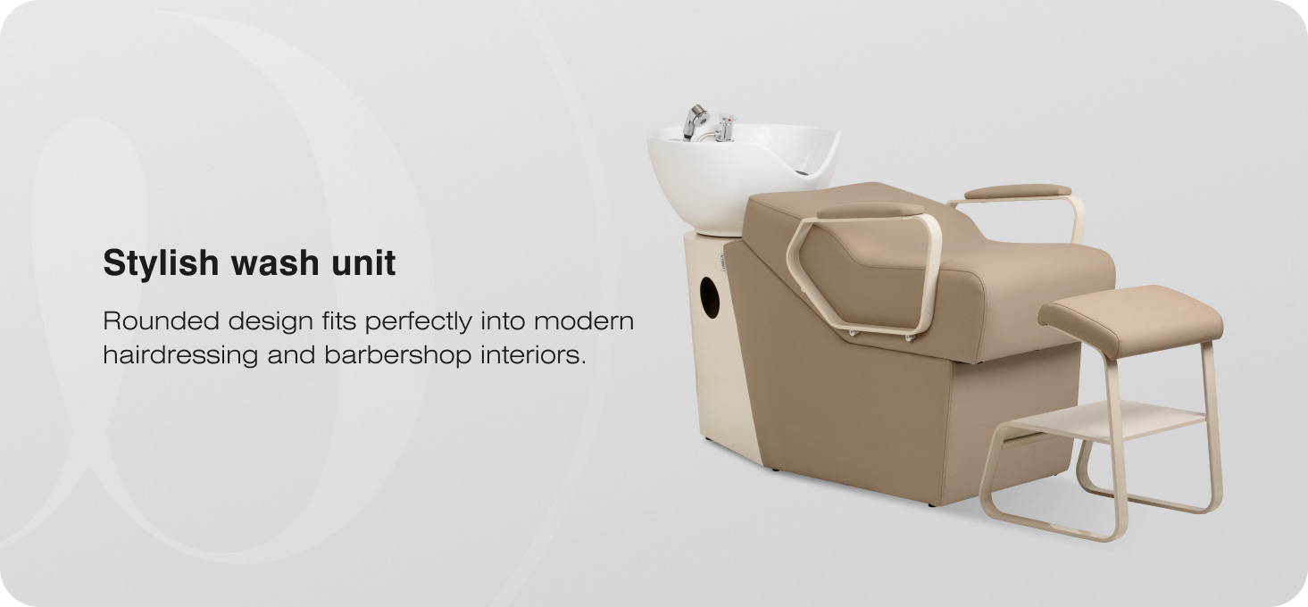 The Omega Marina hairdressing wash unit combines minimalist design with practical solutions that enhance the comfort of daily work. The integrated construction ensures stability and a cohesive, aesthetic appearance of the station, while the rounded form fits perfectly into modern hairdressing and barber shop interiors. The ergonomically profiled seat allows the client to adopt a comfortable, semi-reclined position, while the matching footrest further enhances comfort during treatments. The chair is equipped with a comfortable backrest and profiled armrests, providing stable support and enhancing the comfort of using the wash unit.