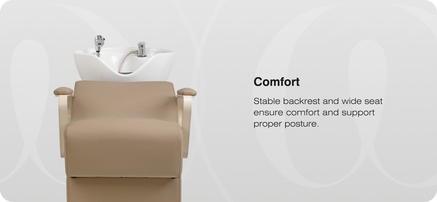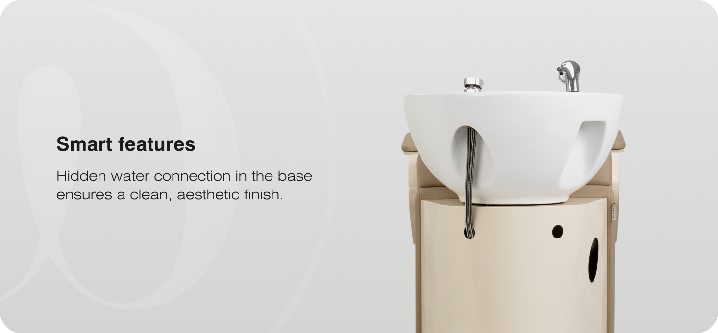The deep, rounded white ceramic basin minimises splashing of water and products, helping to keep the workstation clean. The durable ceramic is highly resistant to discolouration, scratches and chemical agents. The profiled collar provides stable support for the client’s head, while a practical support in the basin allows for a comfortable head position. A silicone cover reduces the sensation of cold, enhancing the client’s comfort during treatments.