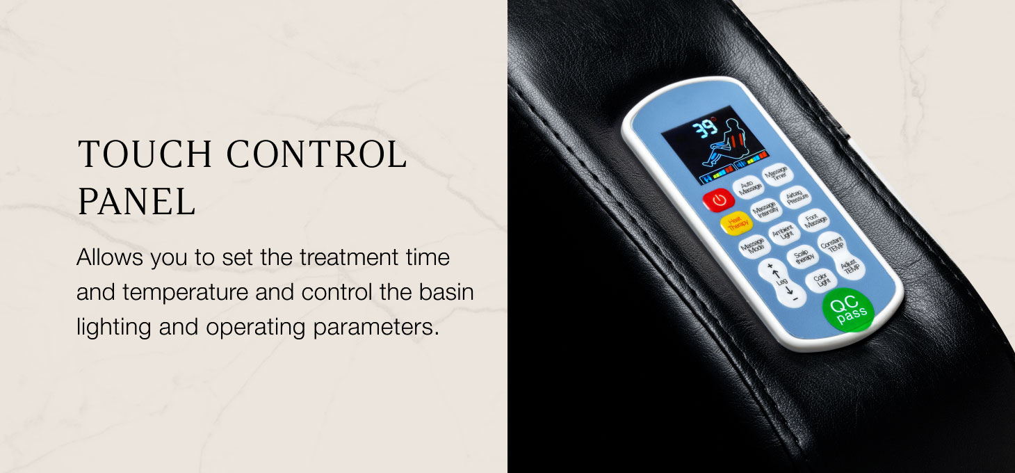 The control panel, located on the back of the right armrest, provides the specialist with convenient and full control over the treatment parameters. It allows the temperature of the closed-circuit water to be adjusted within the range of 30–50°C and its value to be monitored in real time on a clear display, enabling precise adjustment of settings to the client’s needs. The panel also allows the light therapy function to be activated in the form of bowl illumination, which creates a relaxing atmosphere and emphasises the luxurious nature of the treatment. From the panel, you can adjust the massage intensity, activate the back heating function and select the massage duration – set to 20 minutes by default, with the option to adjust to 10, 15, 20 or 40 minutes. The system offers three levels of massage intensity delivered by the massage heads and three levels of pressure massage using air bags, allowing the device’s operation to be precisely tailored to the client’s individual preferences.