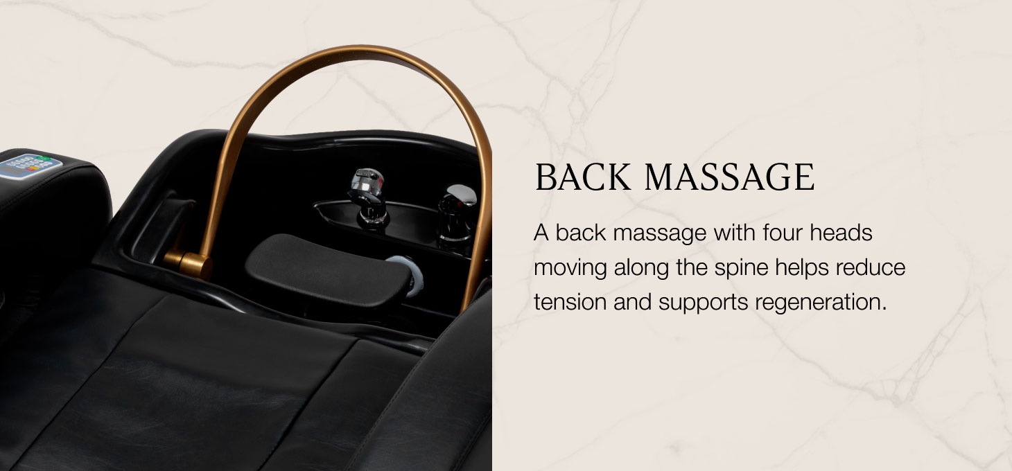 The back massage provides deep relaxation and effectively reduces muscle tension. Four massage heads move up and down along the spine, mimicking the movements of human hands. The use of kneading and tapping techniques supports the body’s regeneration and helps to reduce pain. After each session, you feel distinctly relaxed, and your muscles remain noticeably loosened.