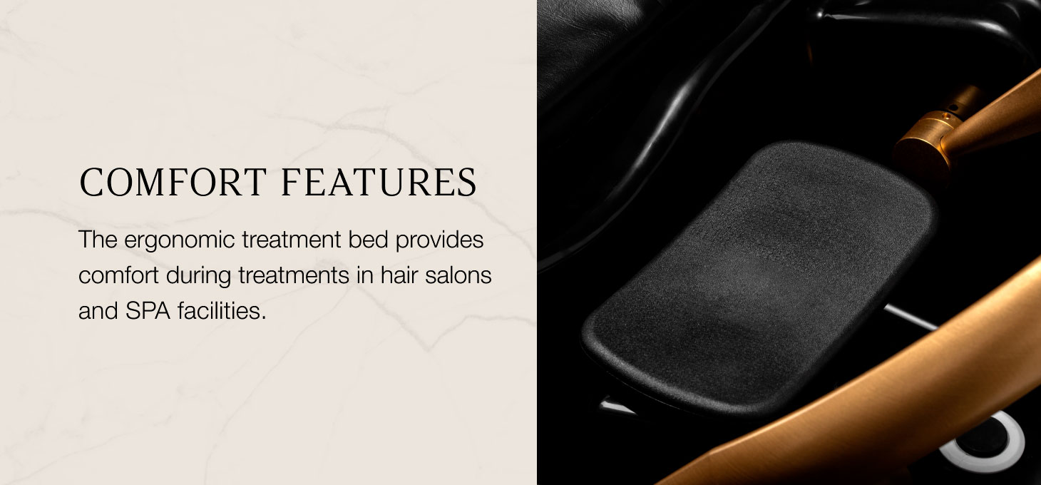 The Head Spa treatment bed combines a stable construction with a modern design, emphasising the professional character of the salon’s interior. The ergonomically profiled surface, covered in soft synthetic leather, ensures high comfort during treatments and promotes complete relaxation for the client. Carefully refined details give the unit an exclusive look, enhancing the aesthetics of the space. Introducing the Head Spa wash unit to your range allows you to expand your services to include premium treatments, distinguish your salon in the market, and increase the appeal of your offering to clients seeking relaxing beauty rituals.