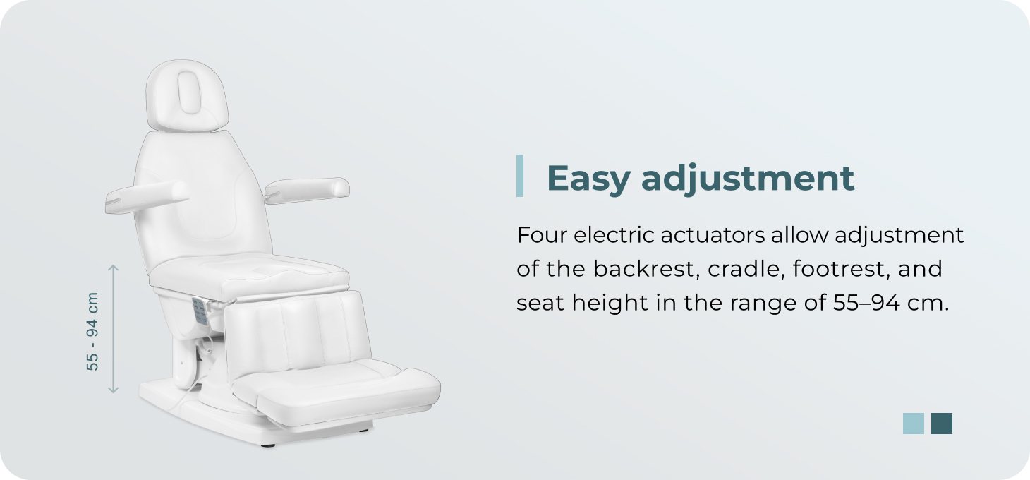 The chair can be conveniently adjusted using an intuitive wired remote control, which allows for smooth control in four dimensions: height, backrest, cradle and footrest. The seat height can be adjusted from 55 cm to 94 cm, allowing for adjustments to the practitioner's height and the type of procedure being performed. When fully extended, the chair reaches a length of over 200 cm, ensuring comfort for users of different heights. For added convenience, the remote control can be hung on a holder near the seat, preventing it from getting in the way during work. A foot switch (code 133026) can be connected as an option.