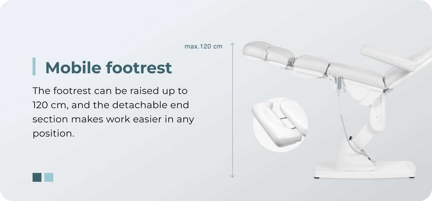 The specially designed footrest significantly facilitates pedicure and podiatry treatments. It is wide and stable, and its angle can be smoothly adjusted using an electric remote control. This solution allows for comfortable leg support and proper positioning, increasing the comfort of both the client and the person performing the treatment. The extendable footrest makes the chair perfectly suited to taller users, providing them with adequate support. The removable end of the footrest allows the practitioner to have full freedom of access to the feet and toes, providing greater comfort and precision during demanding treatments. With the seat raised to its maximum height, the footrest extended, and the cradle tilted, the height reaches approximately 120 cm, further facilitating precise work during specialist podiatry procedures.
