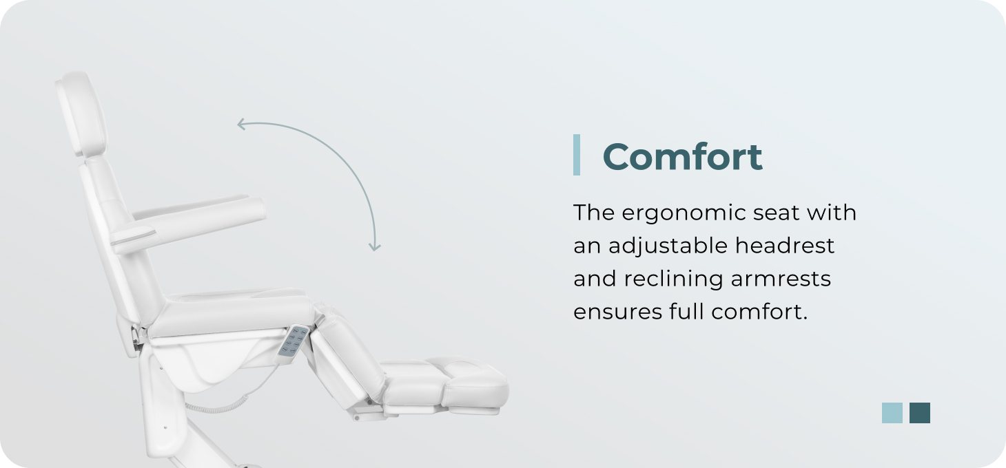 The comfortable, ergonomically profiled seat ensures a comfortable and stable body position during treatments. The design allows the chair to be reclined to a lying position, and the practical opening in the headrest, discreetly hidden under the pillow, also makes it ideal for massages and back and body treatments. The extendable headrest allows the chair to be adjusted to the client's height and the type of treatment being performed. Stable armrests provide comfortable arm support, and the ability to tilt them back makes it easier to get into the chair.