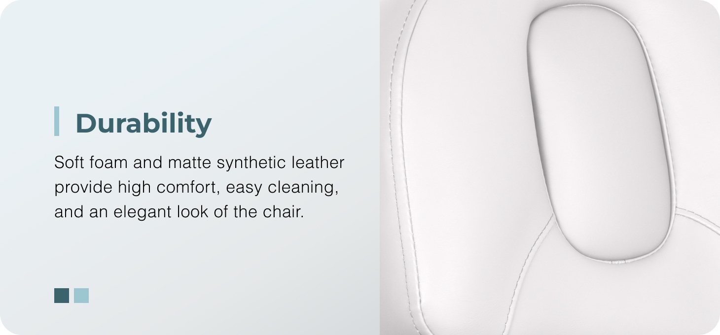 The soft foam filling and upholstery made of soft, pleasant to the touch, matte synthetic leather in shades of white guarantee comfort and ease of cleaning. The material is moisture-resistant, and carefully crafted stitching emphasises the elegant character of the furniture. The solid construction ensures stability and long-lasting use, while the minimalist design in classic colours makes the chair a perfect complement to modern interiors decor.