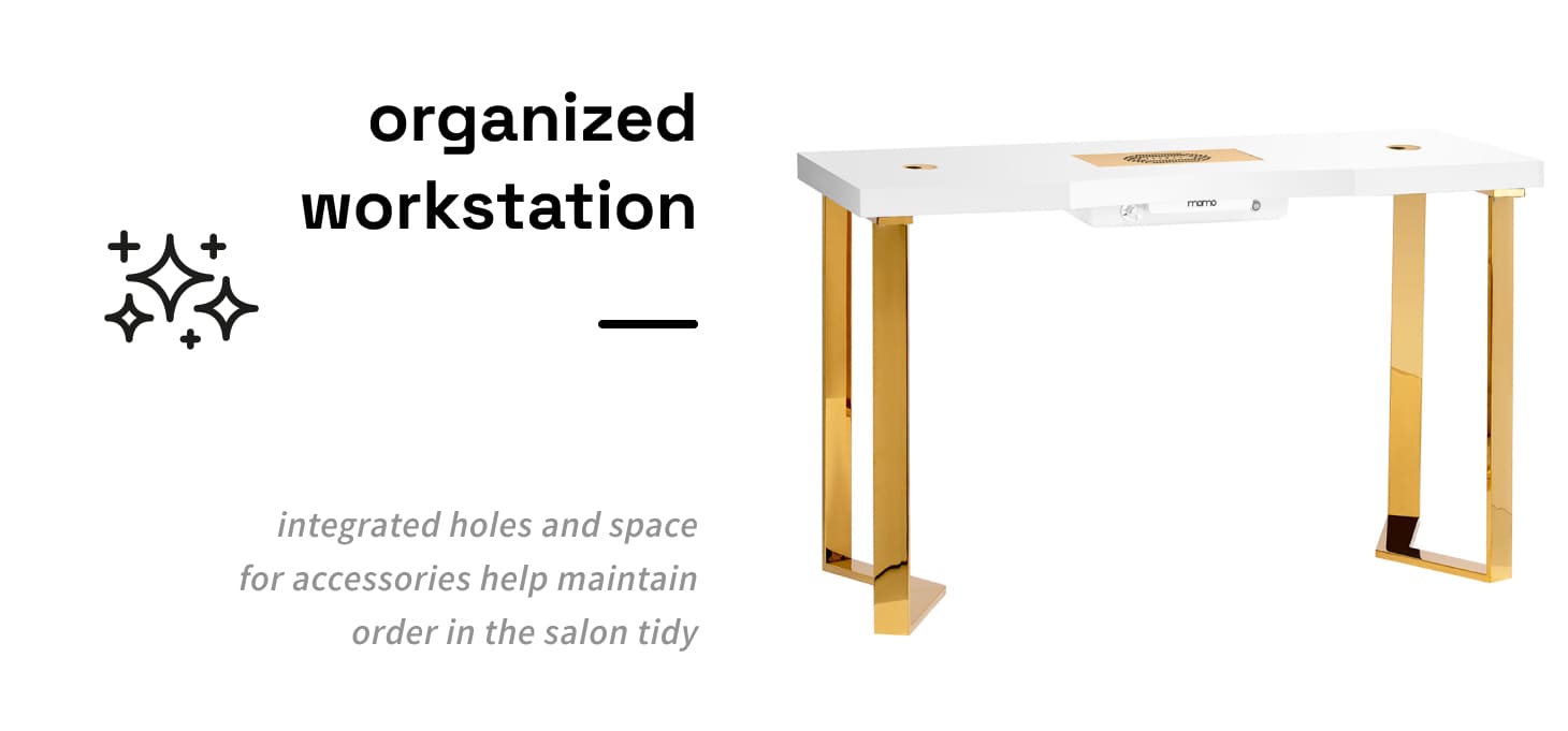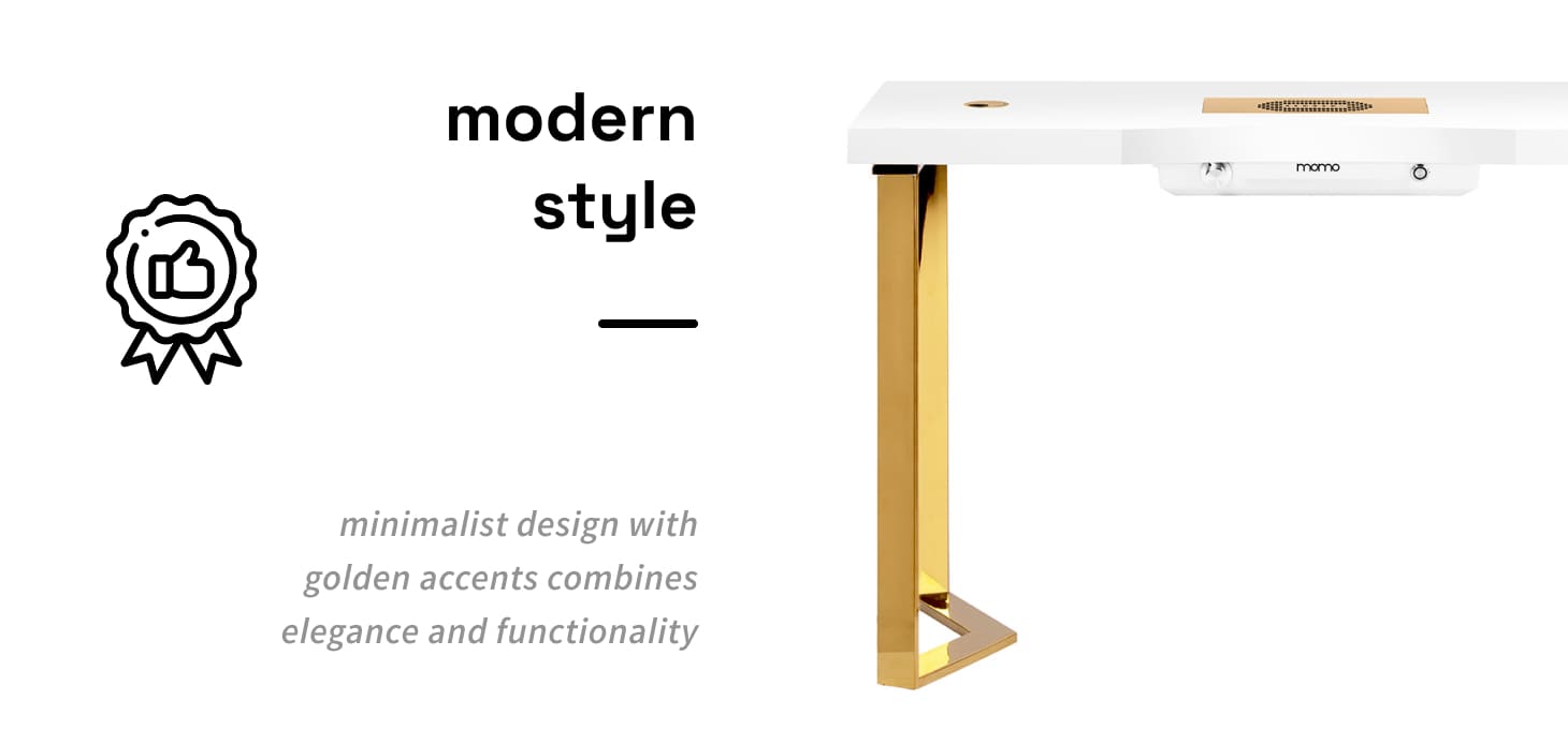 The Momo 05 cosmetic desk is a unique combination of simplicity and style, designed for demanding users. Minimalist design with gold elements adds an elegant character. The smooth, high-gloss top guarantees comfort while performing everyday duties in the beauty salon.