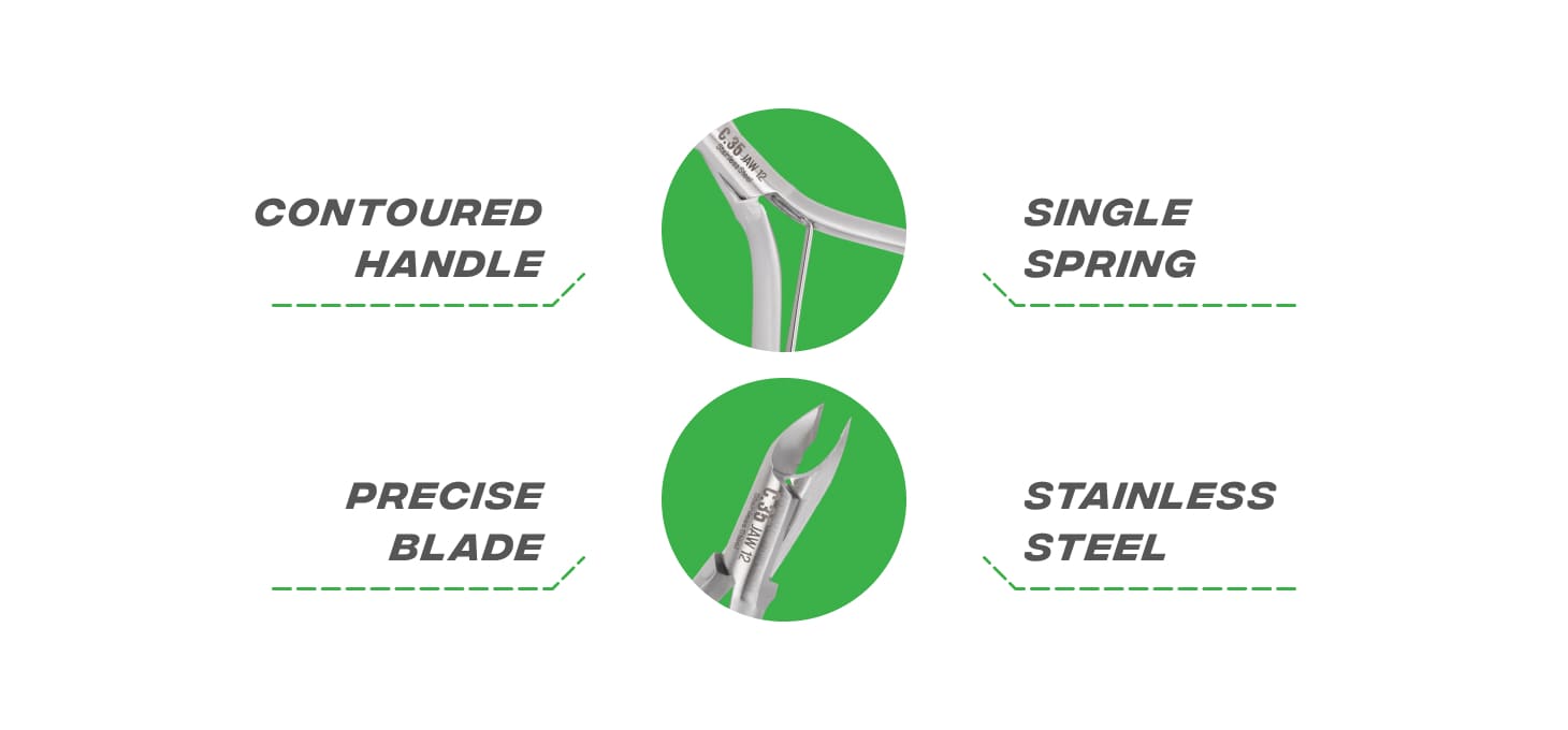 A single spring connects the arms of the nippers, providing control and cutting precision. Careful workmanship allows for comfortable, quiet and smooth operation. Proper profiling and optimal arm size ensure that the nippers sit securely in the hand, guaranteeing comfort even during prolonged treatments. The matte finish emphasises the elegant character of the tools while also ensuring durability and ease of cleaning. As a result, the nippers are suitable both for professional use and for nail care at home.