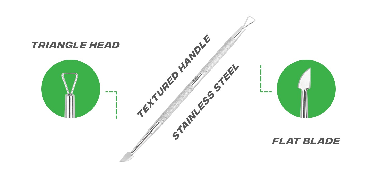 • Flat blade effectively removes cuticles from the sides of the nail. Proper shaping allows for smooth and precise work.