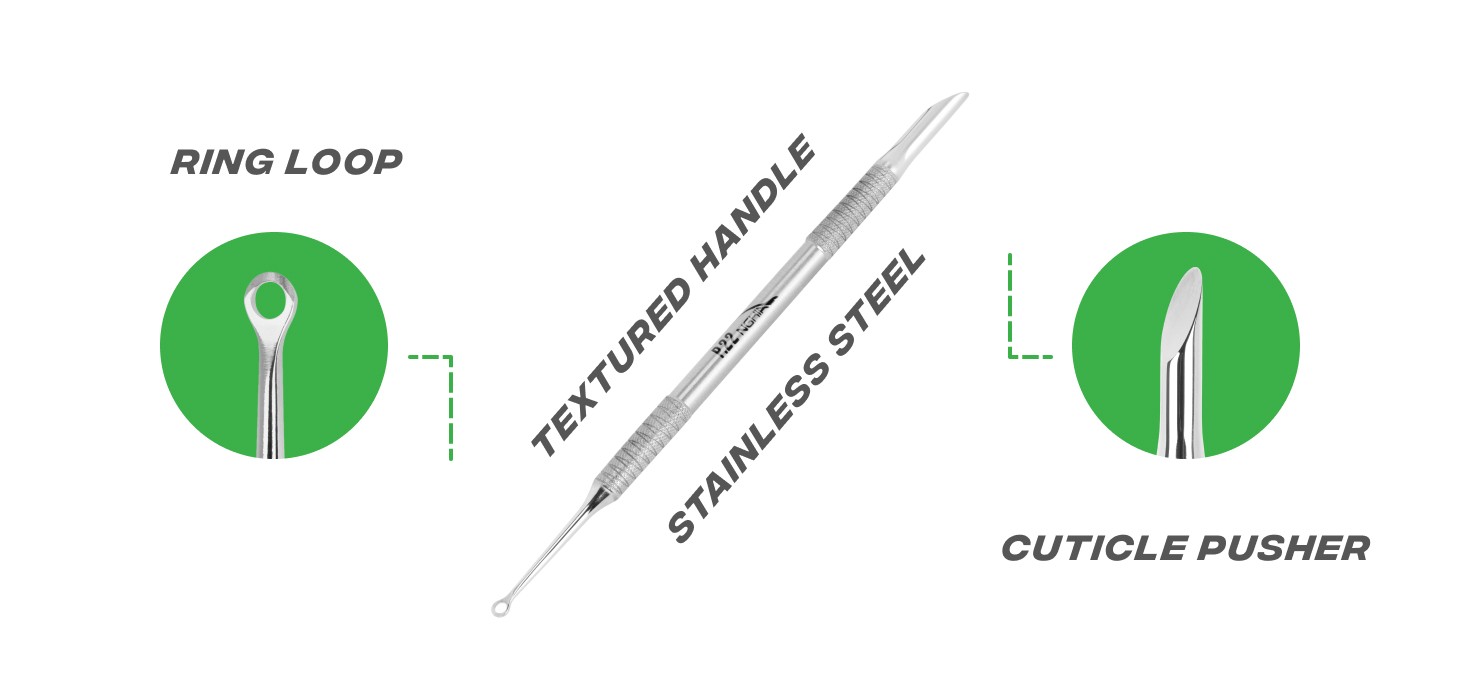 • Ring-shaped loop is ideal for removing cuticles from the nail plate and the surrounding nail folds.
