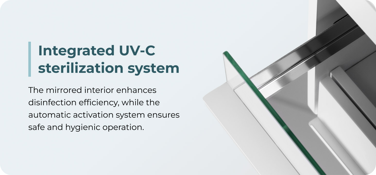 The drawer with a built-in UV lamp allows for hygienic protection of tools between treatments. The mirrored interior finish supports even distribution of UV radiation, increasing the effectiveness of sterilization. The system is activated only when the drawer is fully closed, promoting safe use, maintaining high sanitary standards, and supporting extended UV lamp lifespan.