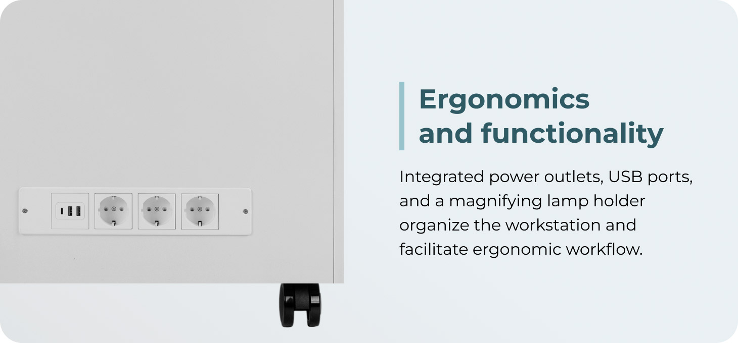 The assistant has a rear panel with three network sockets, two USB ports and one USB-C port, allowing for convenient connection of various types of devices. Cable grommets located in the walls near the top drawer help to keep things tidy. The integrated magnifying lamp holder allows the lamp arm to be securely mounted close to the treatment area without taking up space on the worktop, promoting precise lighting and ergonomic working.