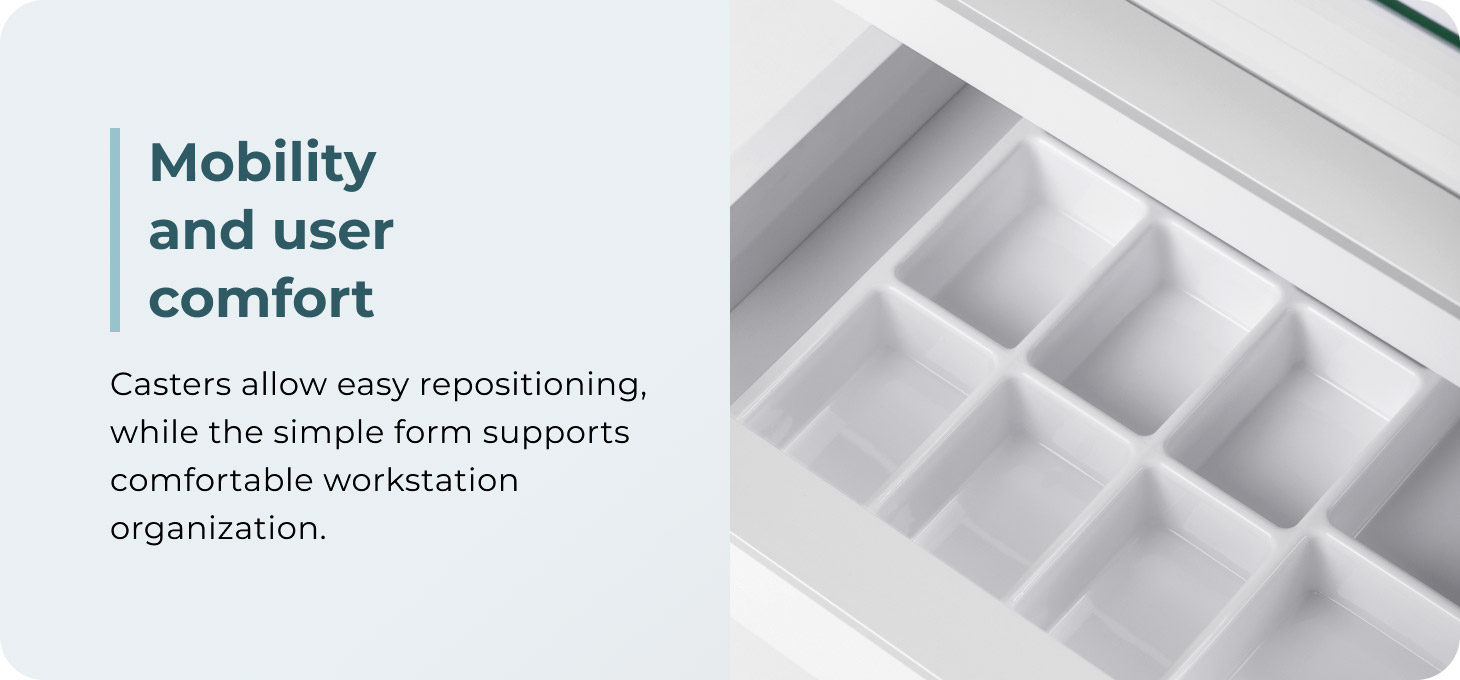 Practical castors facilitate the smooth movement of the cabinet. The simple, minimalist form in white gives the furniture a universal, professional look that fits well into modern interiors. The design, created with podiatry professionals in mind, provides a dedicated space for a podiatry drill and essential accessories, promoting comfortable and ergonomic work during procedures.