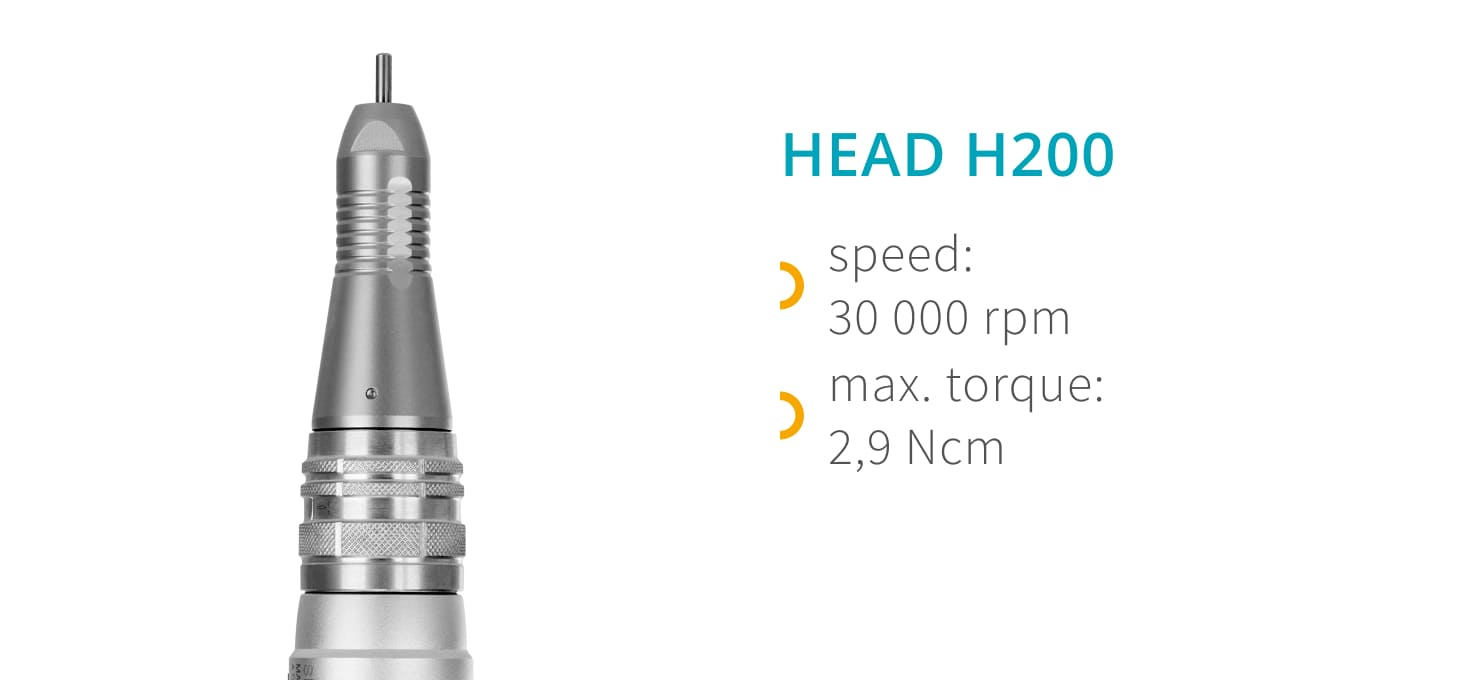 The functional H200 handpiece fits perfectly in the hand, which guarantees high comfort of work. It is equipped with an easy-to-use Twist-Lock system, which allows for quick and smooth drill bit changes. Thanks to this, working with the device is extremely easy and intuitive, which will also be appreciated by more demanding users. The piece is properly balanced and ergonomically profiled, and in addition, the vibrations of the handpiece have been reduced, so that working with the nail drill for many hours do not tire the hand excessively. The flexible spring cable provides high comfort of work, reaching up to 135 cm in length when stretched considerably.