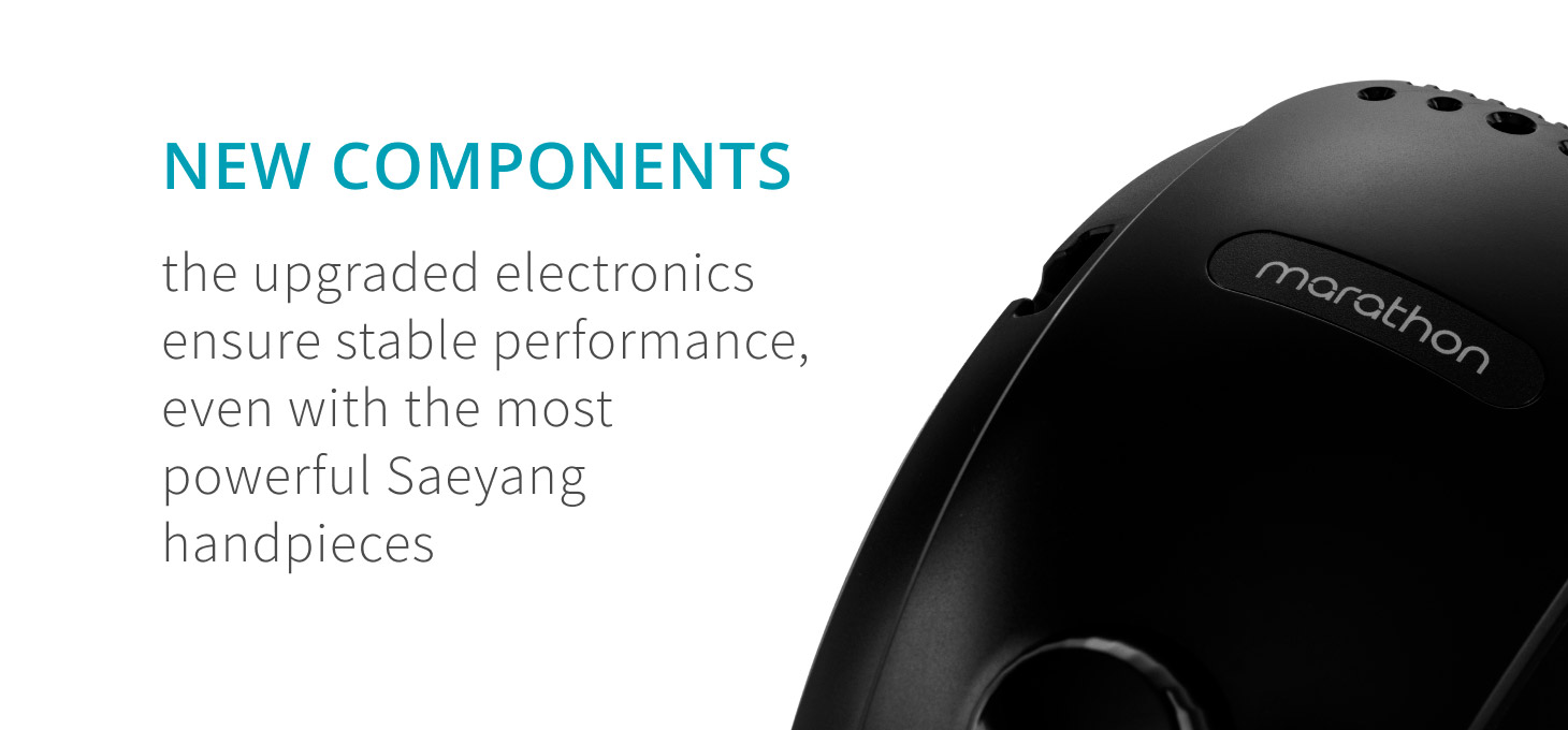 The refreshed version of the iconic Saeyang Marathon 3 Champion has been equipped with an enhanced electronic design and a new transistor system. The upgrade increased the device’s resistance to load and improved work stability, resulting in higher efficiency when working on cuticles and nails. The latest Saeyang Marathon 3 Champion NEW offers even better cooperation with more powerful handpieces, such as the SH37LN, ensuring smooth and uninterrupted operation even during intensive use.