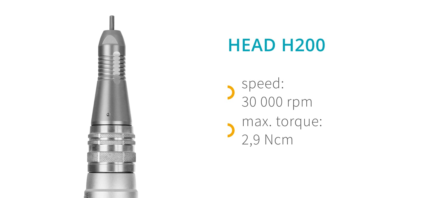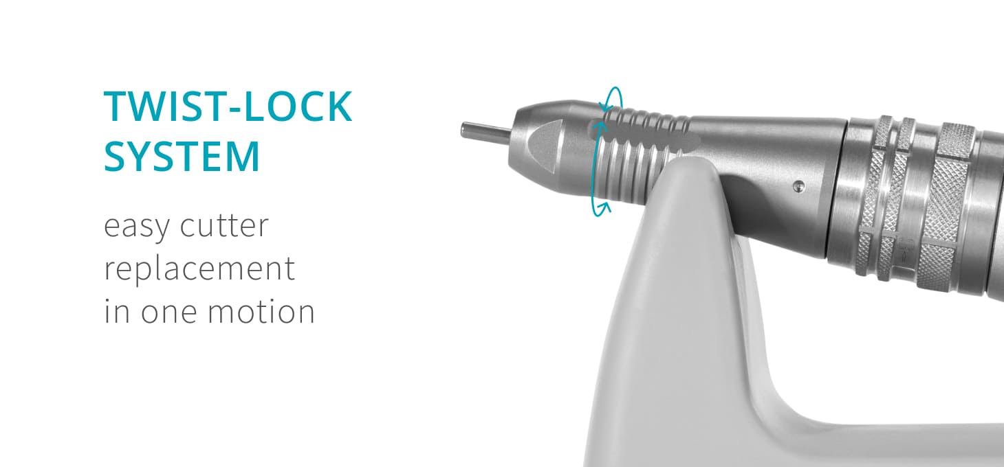 The functional, precise head fits perfectly in the hand, which guarantees high working comfort. It is equipped with an easy-to-use Twist-Lock system, which allows for quick and smooth replacement of bits. This makes working with the device exceptionally easy and intuitive, which will also be appreciated by more demanding users. The element is properly balanced and ergonomically profiled, and additionally, head vibrations have been reduced, so that even many hours of work with the nail drill machine do not tire the hand excessively.