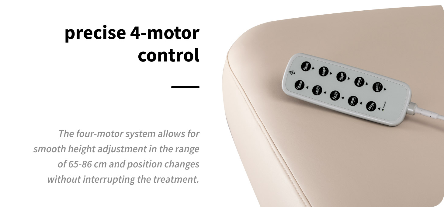 The intuitive remote control allows for smooth adjustment in four planes – including height, backrest angle, footrest and cradle function. Electric height adjustment in the range of 65-86 cm and precise angle adjustment allow you to perfectly adjust the position of the bed to the type of treatment being performed. The wide range of adjustments makes it easy to maintain an ergonomic working position, regardless of the specialist's height or the specifics of the procedure. The ability to simultaneously adjust the backrest and footrest with a single button allows you to quickly set the sitting, reclining or lying position without interrupting the treatment. Smooth adjustment of settings supports ergonomic working and increases client comfort at every stage of the procedure.