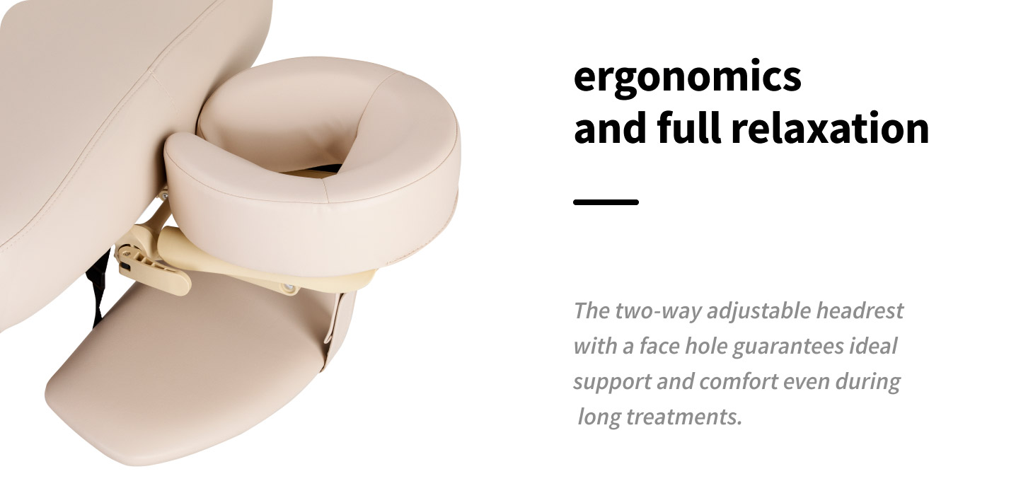 The ergonomic headrest with a face opening, included in the set, ensures a comfortable head position during treatments performed on the back, stomach and in the supine position. Adequate support increases client comfort even during longer procedures and promotes complete relaxation. The element has two-plane angle adjustment, which allows for precise adjustment to the type of treatment and individual needs.