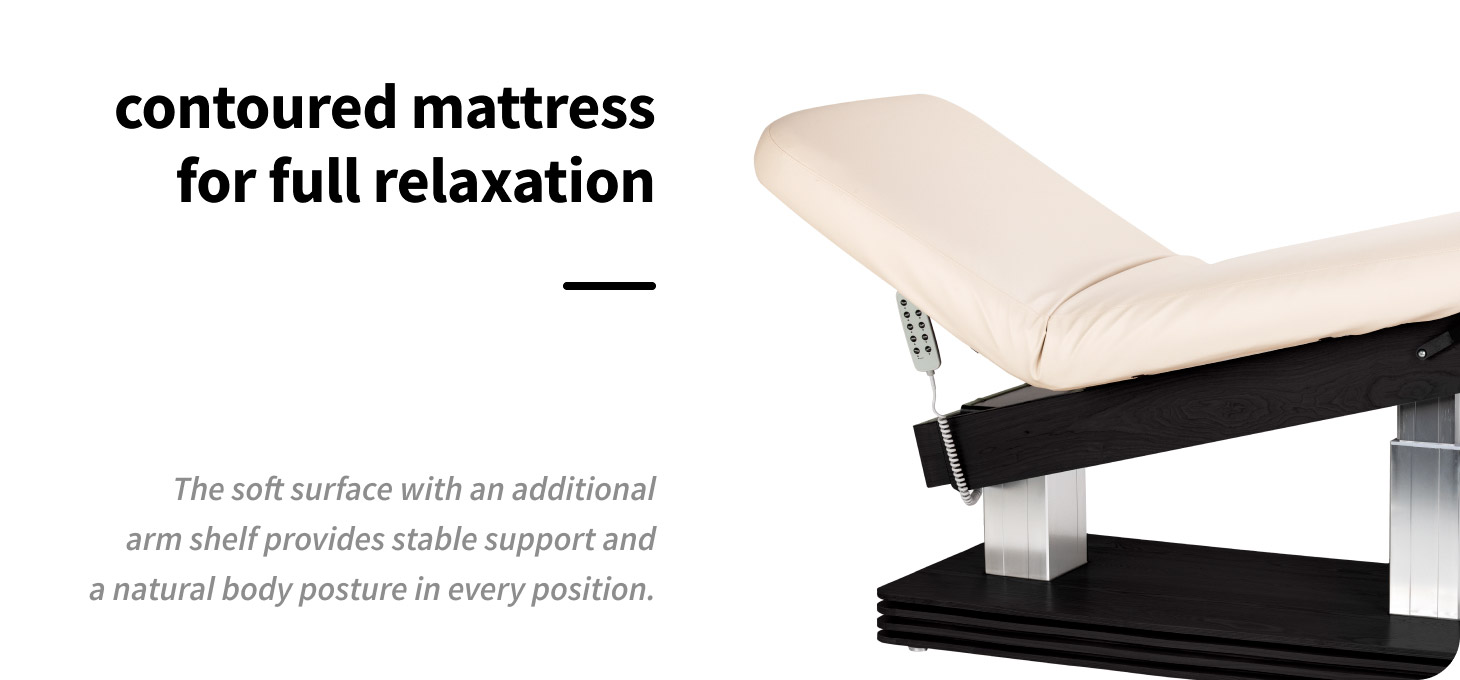 The profiled surface of the lounger promotes a natural, comfortable body position, providing stable and comfortable support along its entire length. The appropriate width and soft mattress increase client comfort, especially during longer treatments. Greater comfort means a better treatment experience and a higher standard of service in the salon. An additional arm shelf increases comfort when lying on your stomach, relieving pressure on the upper body and promoting complete relaxation.