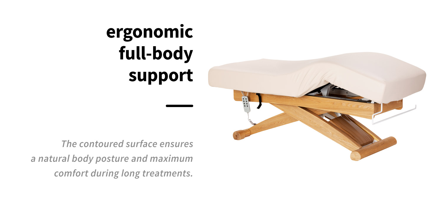 The profiled surface of the treatment lounger promotes a natural body position, providing stable and comfortable support along its entire length. The appropriate width and thick, soft mattress increase the client's comfort, especially during longer treatments. Greater comfort means a better treatment experience and a higher standard of service in the salon. An additional armrest increases comfort when lying on the stomach, relieving pressure on the upper body and promoting complete relaxation. A practical handle on the footrest allows for convenient storage of towels and accessories within easy reach, which improves work organisation and helps to maintain an aesthetic, tidy appearance of the treatment station.