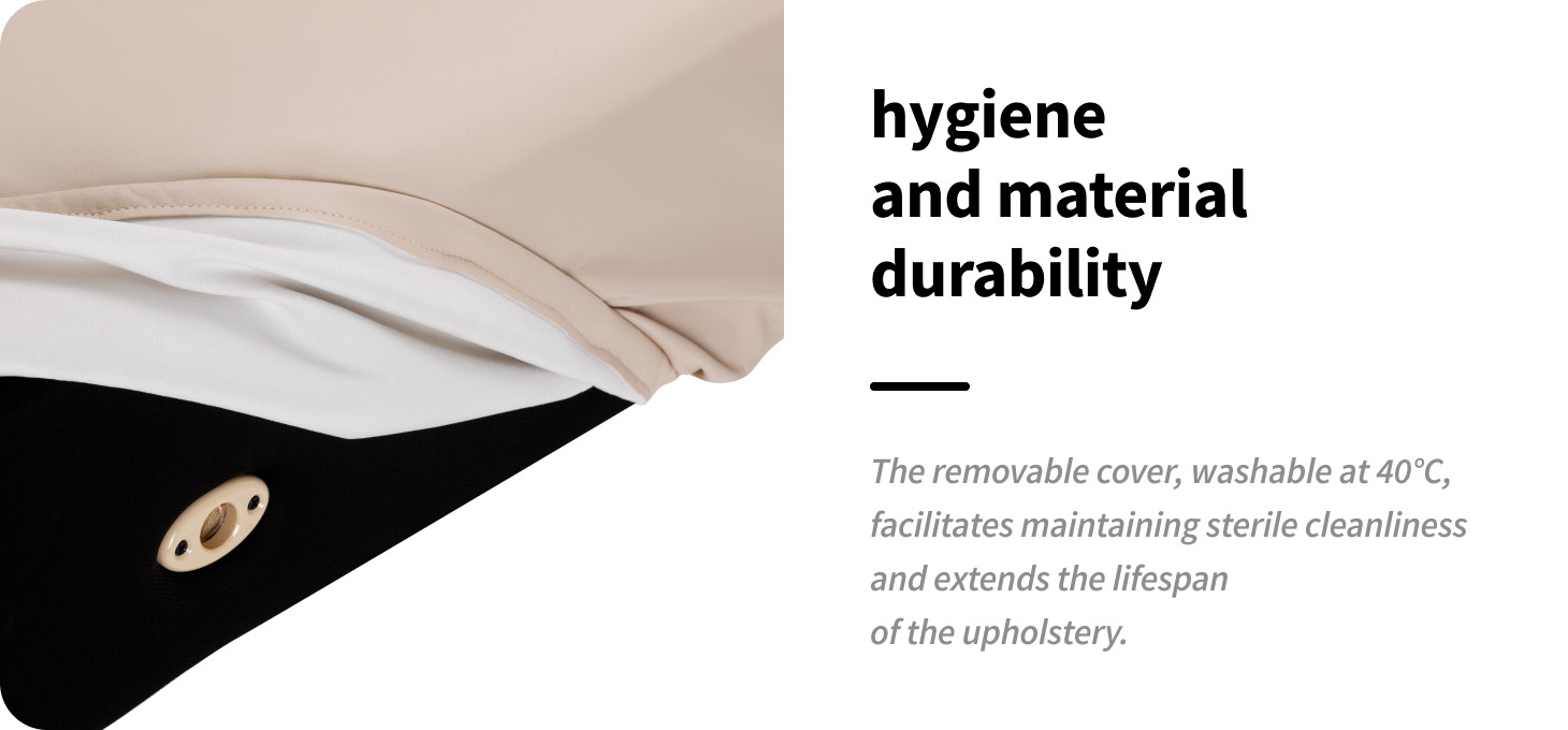 The removable mattress cover makes everyday work much easier. It can be quickly removed and washed (by hand or in a washing machine at up to 40°C), allowing you to easily maintain high standards of hygiene in your salon. Short drying at low temperature speeds up the preparation of the workstation for use. Proper care without the use of alcohol and strong cleaning agents helps to maintain the aesthetic appearance and durability of the material for longer.