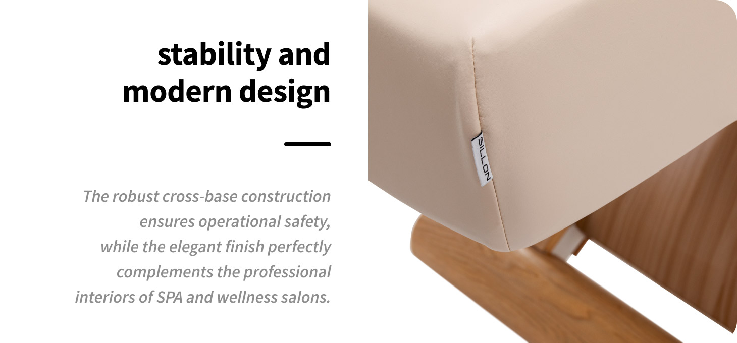 A modern treatment lounger with a solid cross base combines high stability and professional aesthetics. The construction ensures safety during cosmetic, beauty, relaxation and massage treatments, guaranteeing reliable support and comfort at work every day. The universal, subdued colour scheme and refined details make the beauty lounger a perfect match for the decor of beauty salons , massage parlours, and SPA and wellness areas. The consistent, elegant appearance emphasises the professionalism of the interior and enhances the perceived quality of services, building customer trust.