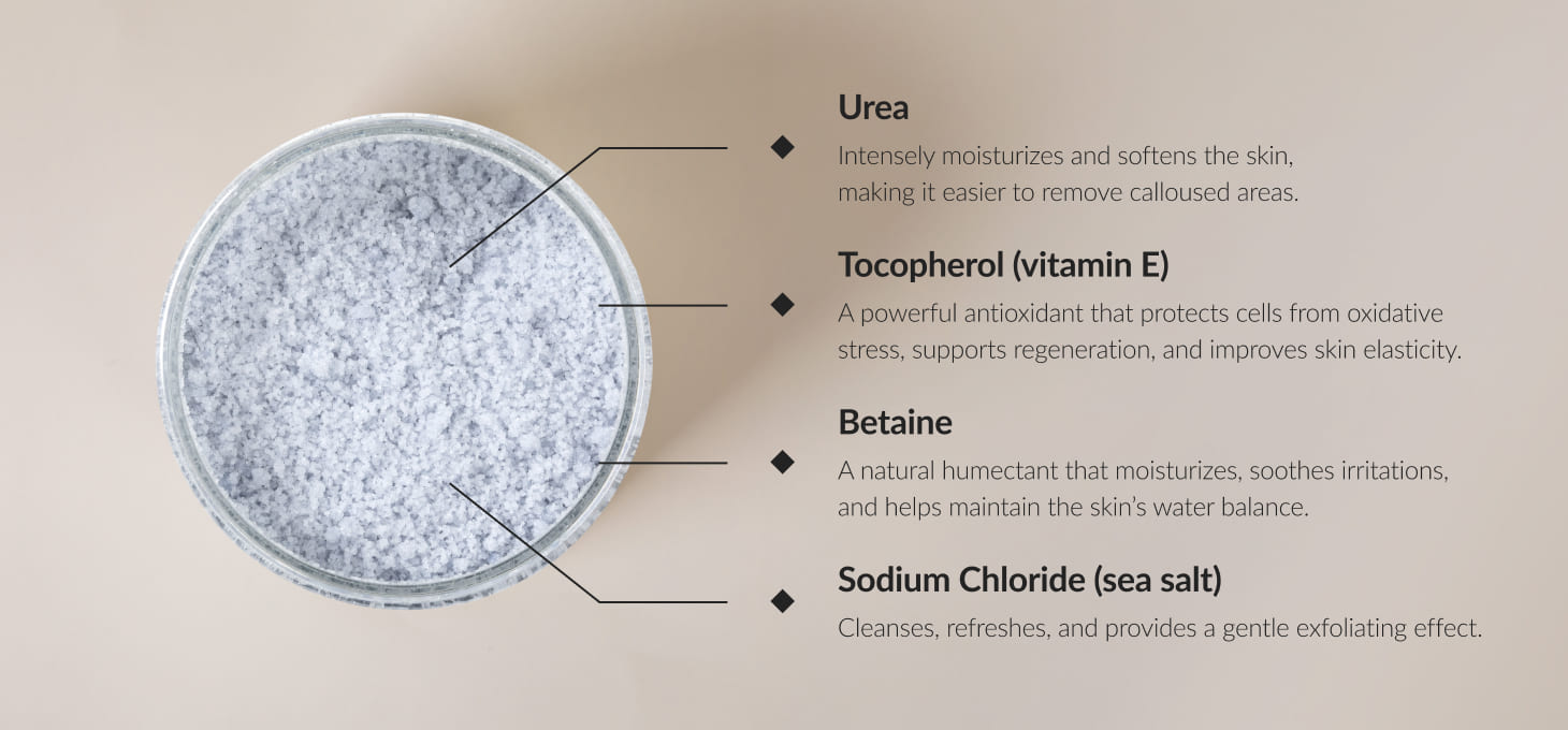 The salt formula is enriched with moisturising, regenerating, and refreshing ingredients. Urea intensely moisturises and softens the epidermis, facilitating exfoliation. Vitamin E has antioxidant properties, helping to protect the skin from oxidative stress. Betaine moisturises, soothes and helps maintain proper skin hydration, while sea salt cleanses, refreshes and gently exfoliates.
