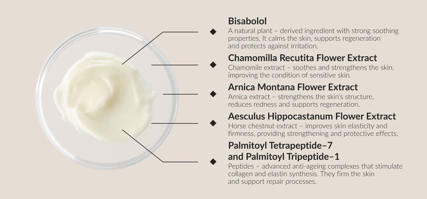 The mask formula combines the effects of natural plant extracts with peptide complexes and vitamin E. Extracts of arnica montana, chamomile and horse chestnut reduce the appearance of capillaries and help reduce redness. Avocado oil, panthenol and bisabolol intensively nourish and soothe the skin, promoting regeneration and protection against external factors. A peptide complex promotes collagen and elastin production, helping to maintain skin firmness and elasticity.
