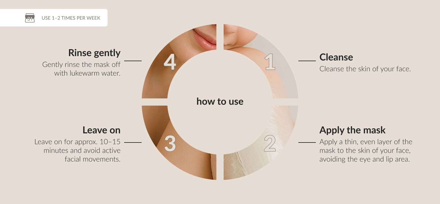 Apply an even, thin layer of mask to cleansed facial skin, avoiding the eye and lip areas. Leave on for 10-15 minutes, then wash off with lukewarm water. Use 1-2 times a week or according to individual skin needs.